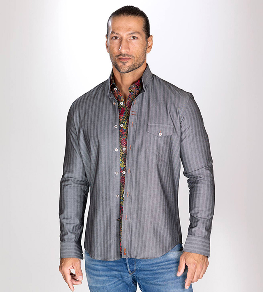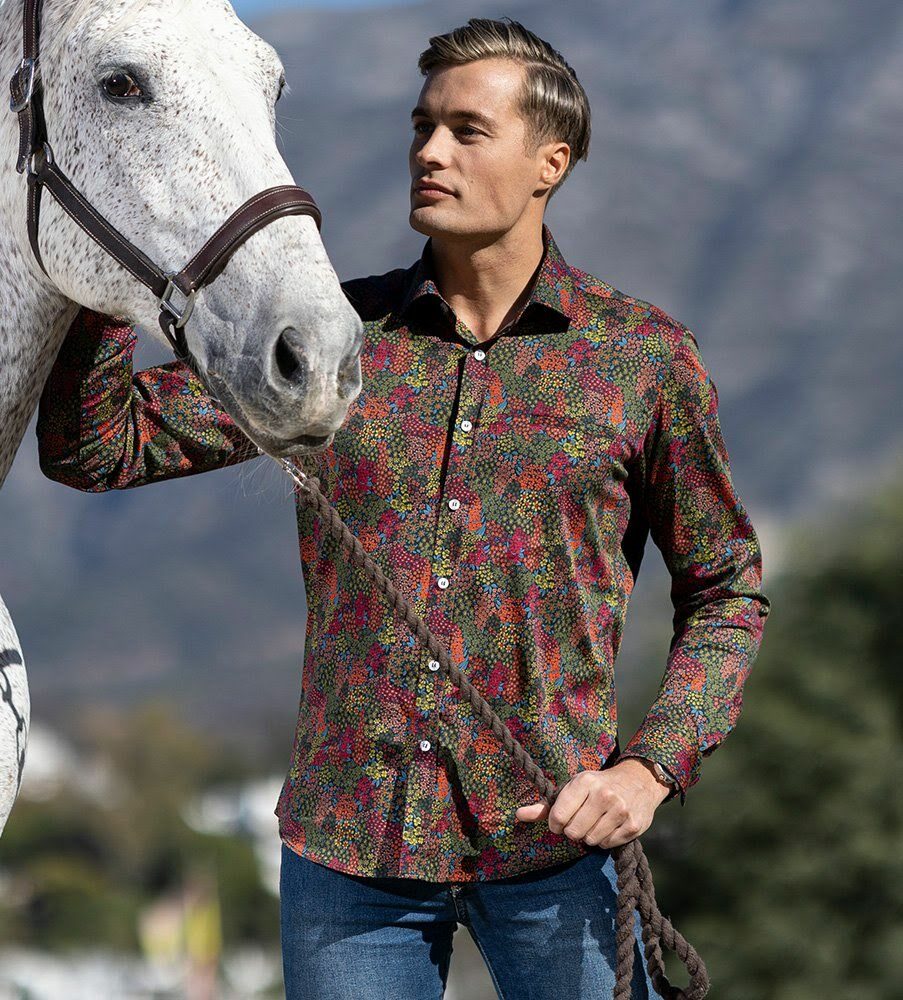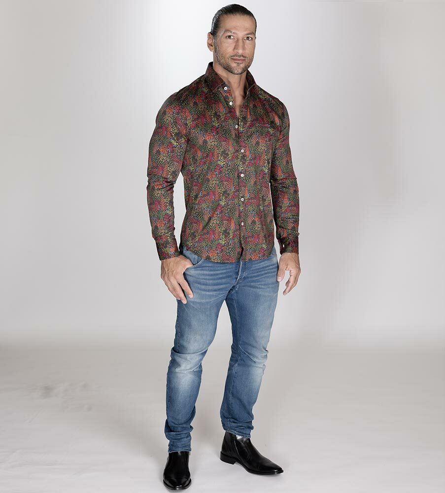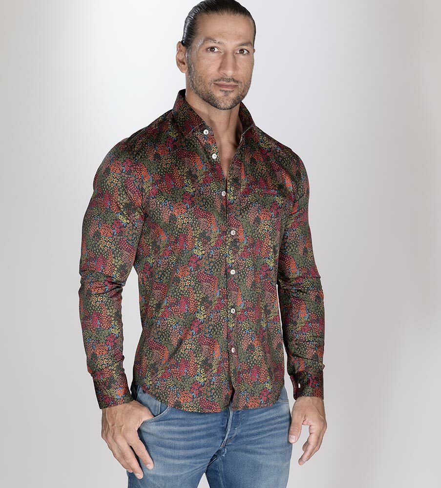 En perfekt, blommig skjorta i vackra, röd-mustiga nyanser. Den här skjortan är uppsydd i ett bomullstyg med 2% elastan, vilket ger plagget en bekväm stretch och samtidigt perfekt passform. Tyget kommer från ett italienskt väveri och har en perfekt lätt lyster som passar modebilden 2022 som hand i handske. På bröstet finns en praktisk bröstficka, och knappslån pryds av grå knappar med mörk ram. Dahlin By Eberståls E-logo-signatur finns elegant broderad, bak på kragen. Innanför kragståndet göms en metallkedja för enkel upphängning. Skjortan kan bäras avslappnat till jeans, eller för en mer uppklädd framtoning, tillsammans med svarta kostymbyxor. På bilden med överskjorta Chevron Steel >>