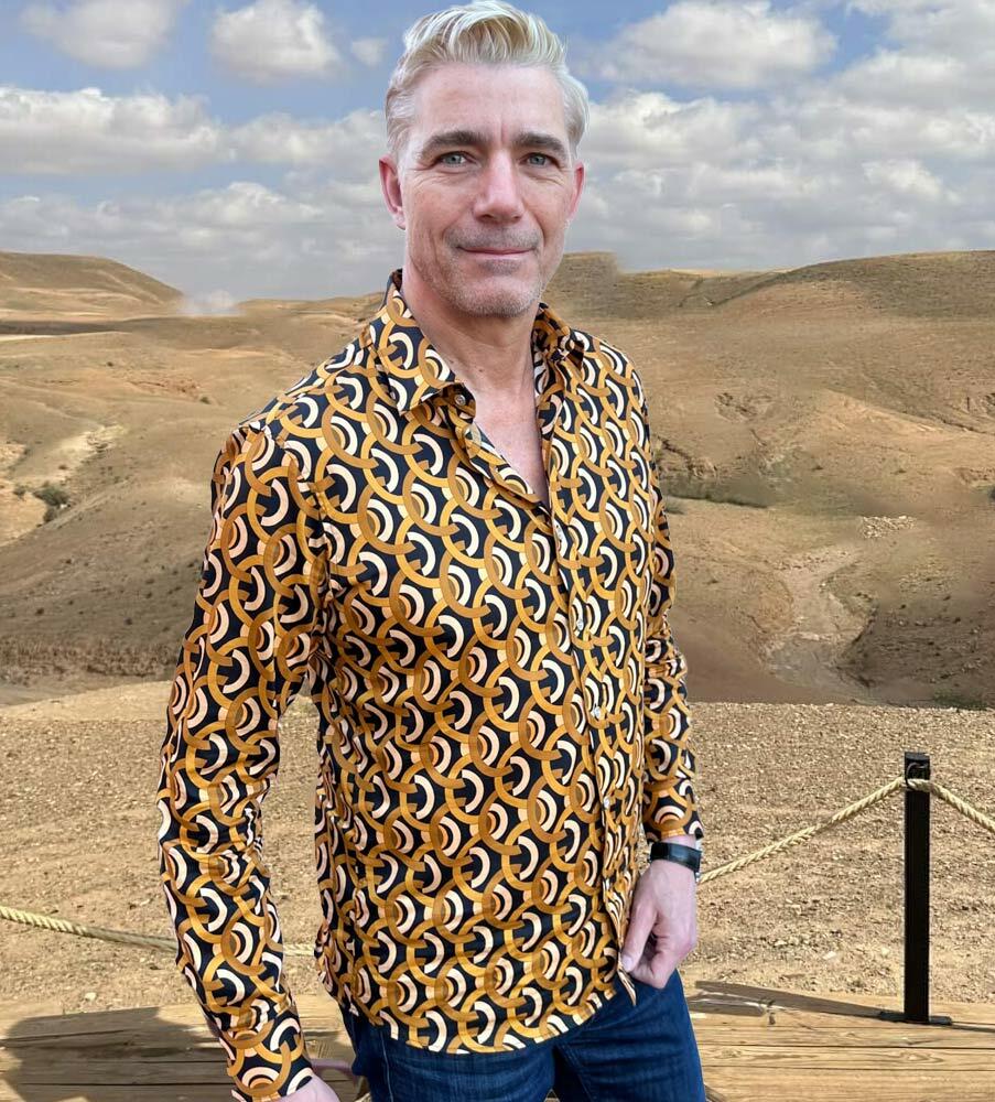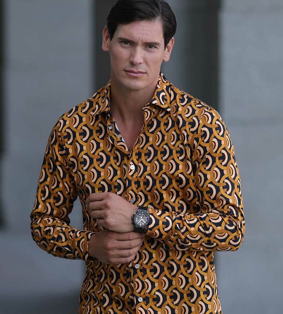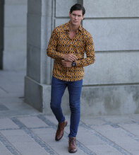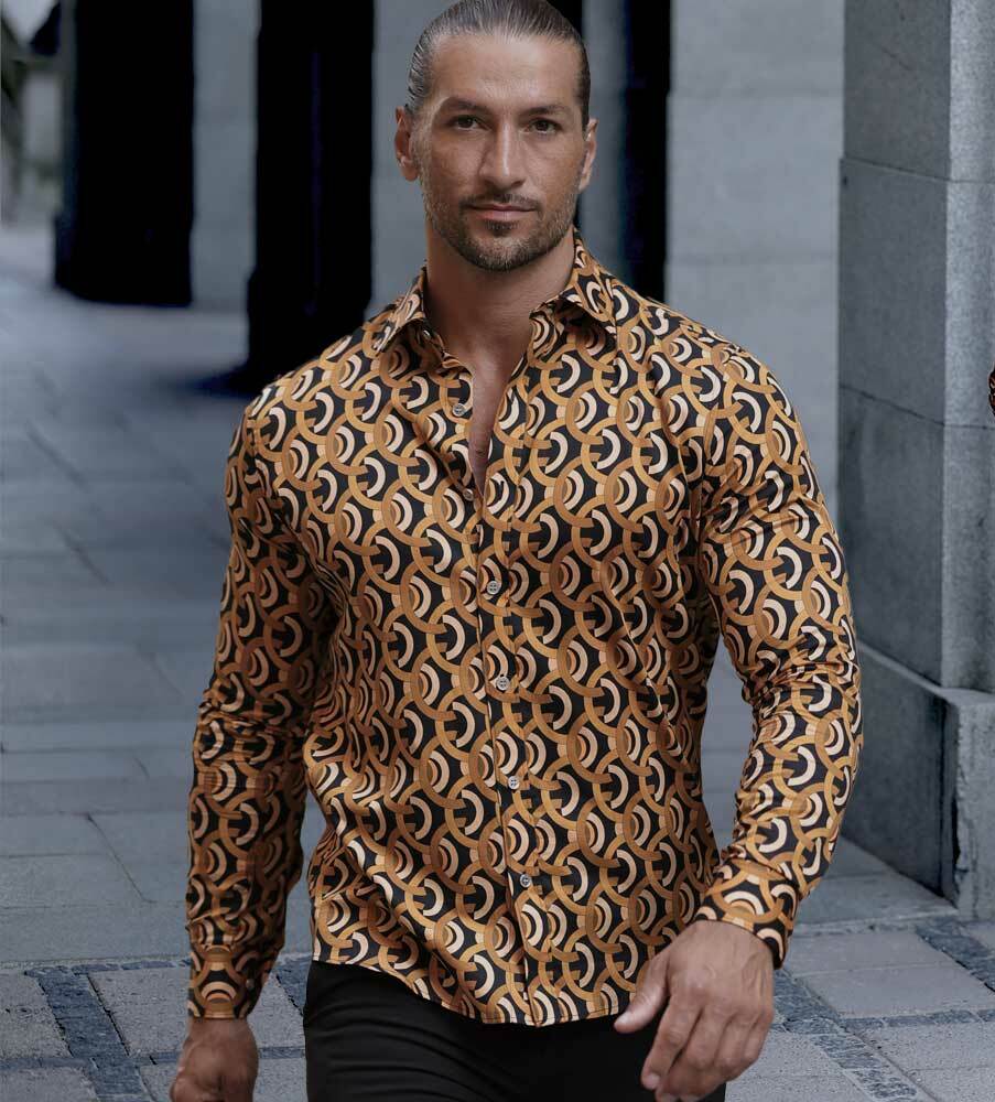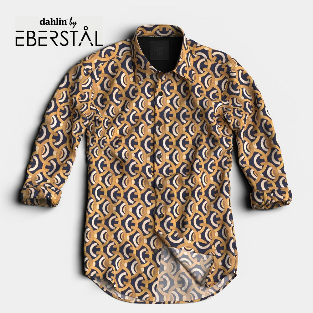 En häftig skjorta i ett fabulöst tyg som gör dig till kung. Mönstret är en mix av valv och bågar som stöttar upp arkitektoniskt. De häftiga knapparna är av gunmetall från arkivet. Det inre oket har en kontrastfärg och i kragståndet finns vår logo-piping. En pärla till skjorta som passar bra att bäras med fållen utanpå byxorna både på festen och på stan. Skjortan är uppsydd i ett högklassig 100% bomullstyg i satinväv från Frankrike.