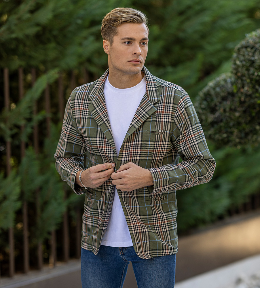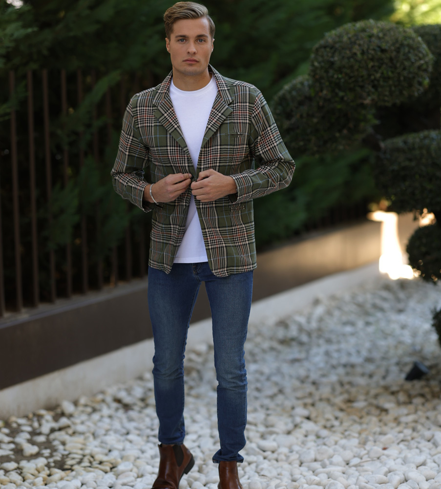 Leisure-blazer i säsongens trendrätta, tartanrutiga mönster. Blazern är både attraktiv och bekväm att använda som överplagg, eller som en cardigan. Den har en liten passpoalficka på bröstet och två större nedtill. Dessutom finns en innerficka för ex. plånbok eller nycklar. Blazern är ofodrad och uppsydd av en trendig boucléväv från Portugal. Två knappar i elegant hornimitation stänger kavajens framsida. Du bär blazern avslappnat med t-shirt, eller kombinerad för en mer uppklädd look tillsammans med en skjorta, gärna med olika mönster på de två plaggen, som trendbilden för hösten 2022 visar. Innanför kragen finns en metallkedja för smidig upphängning. Blazern har en Slim Fit passform. De bruna boots i brunt läder som syns på bilderna heter Gibraltar och Alhambra. Vit t-shirt >>