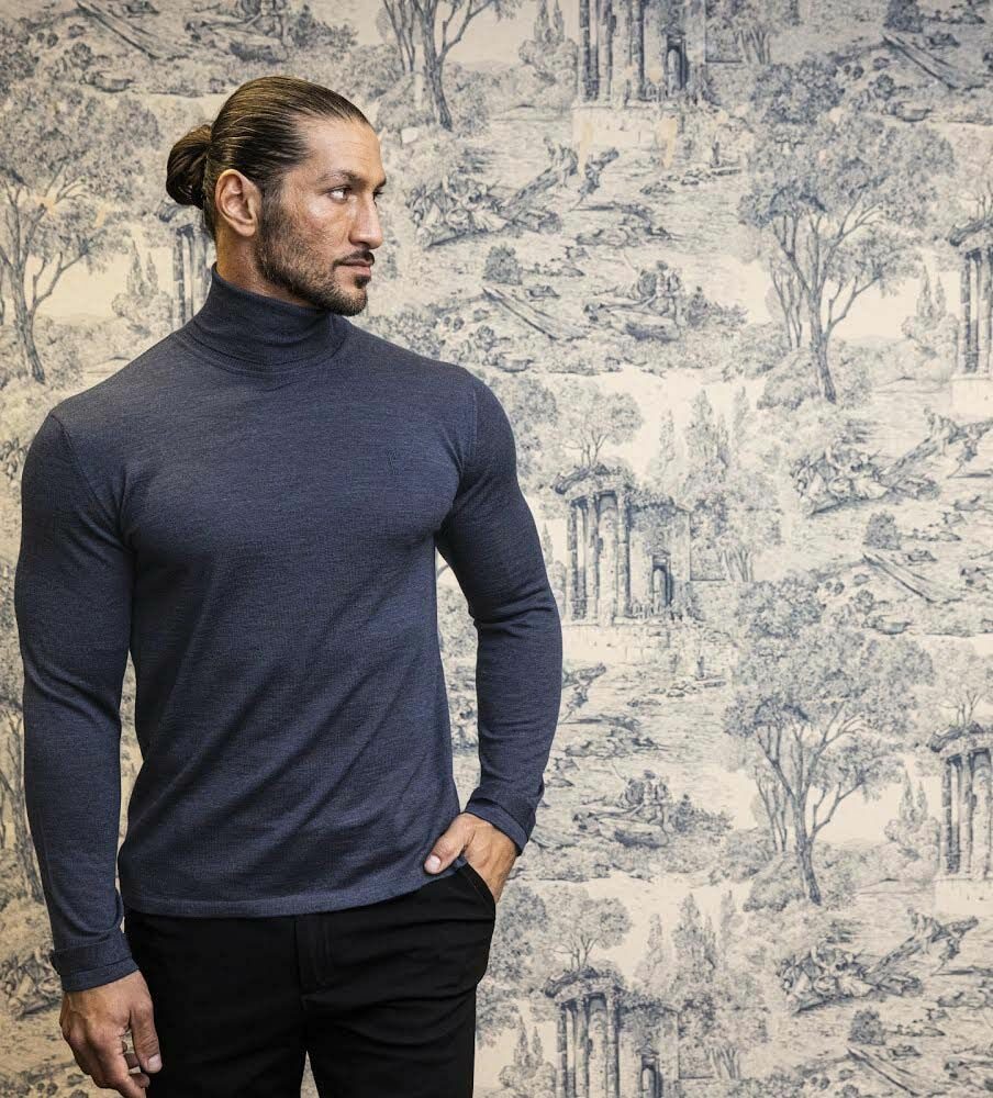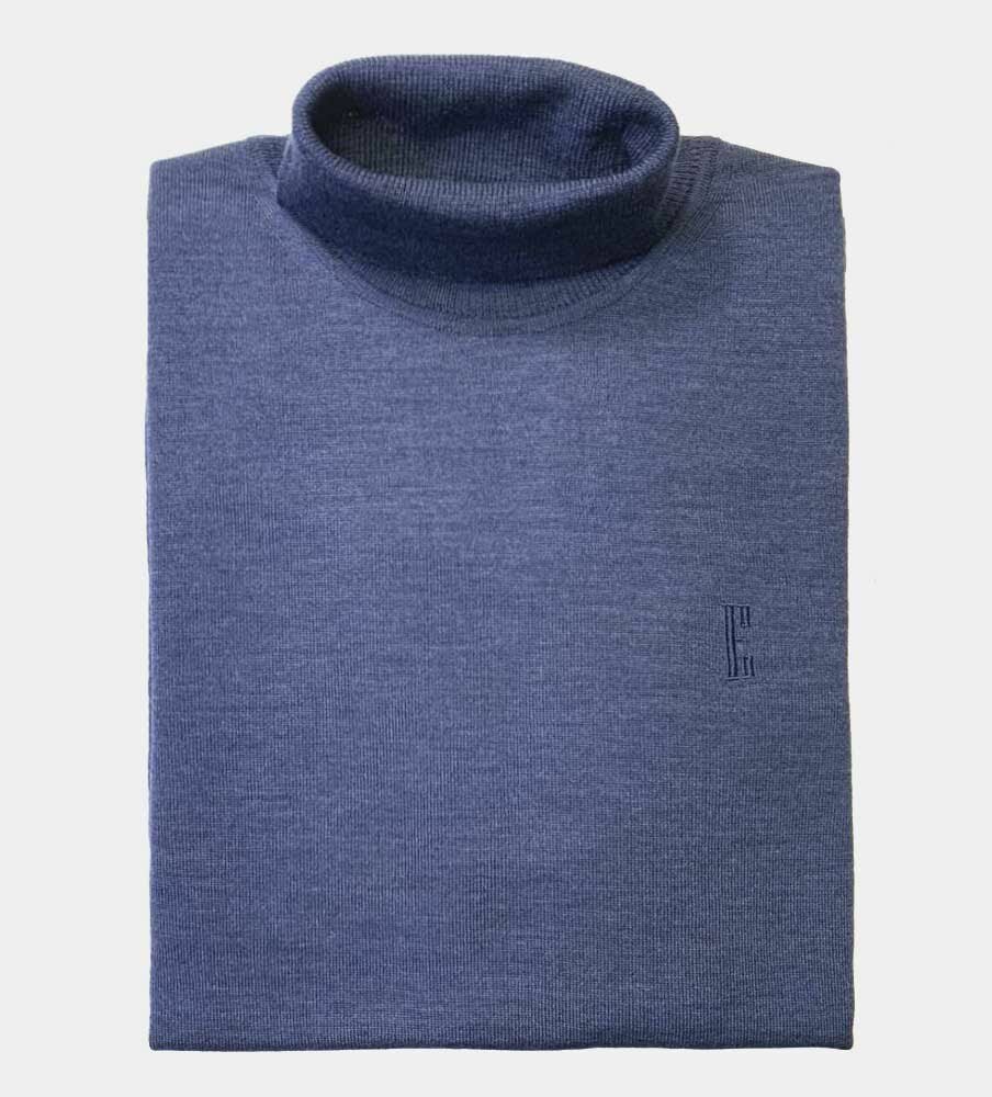 Vår långärmad polotröja är den ultimata polotröjan, här i en finstickad mellanblå nyans. Tröjan är stickad i 100% Extra Fine Merino-ull som både andas och värmer väl. Garnet är importerat från Baruffa, Italien. Tröjan har ett broderat E på bröstet. Polotröjan är stilig men ger ändå en avslappnad look. Fin att bära både för sig själv eller under kavaj eller overshirt. Polotröjan i merinoull i flera fina färger: grå, mellanlbå, marin, beige, oxblodsröd.