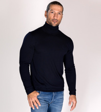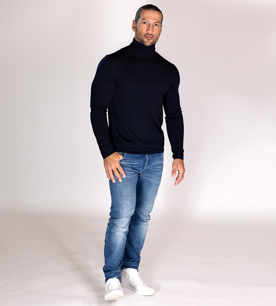 Vår långärmad turtleneck är den ultimata polotröjan, här i en finstickad marinblå nyans med fina miljömärkningar (OEKO-TEX + Traceability and Fashion Certificate CTC0057A + GOALS).
