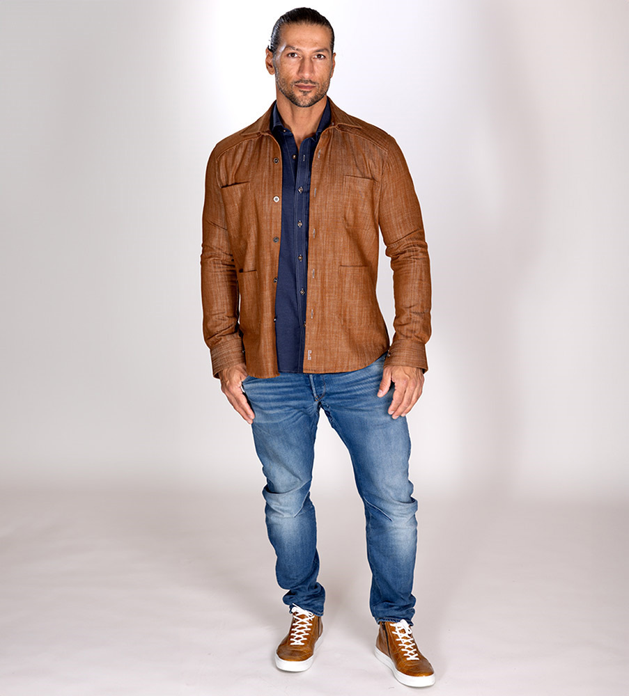 Kashmirskjortans tyg kommer från ett väveri i Portugal och har en vacker blå-melerad nyans med otroligt len och lyxig känsla. Skjortan har designats med dubbelsömmar i kontrasterande brun färg och knapparna är trä-inspirerade med struktur. Den här skjortan i kashmir och bomull kan bli en av de snyggaste och mest bekväma plagg du någonsin ägt. Kopparfärgad överskjorta (bilden) >>