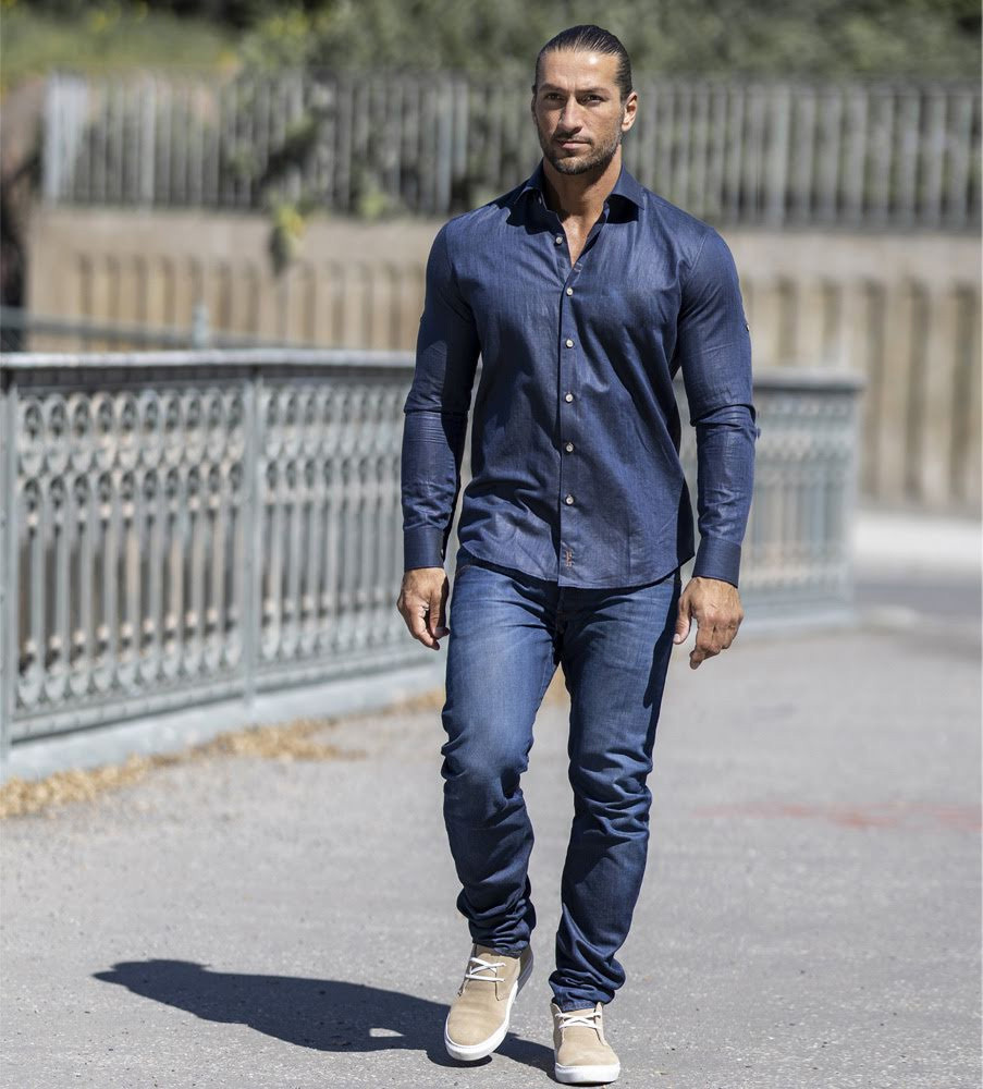 En maskulin, navyblå linneskjorta för somriga dagar. Två dekorativa, horisontella knapphåll på knappslået är anpassade för att hänga solglasögonen i. Inuti ärmen finns en dold flärp och knapp för smart och stiligt uppvik av ärmen när du så önskar. På nedre knappslå finns en dekorativ detaljsöm i matchande färg till de snygga knapparna med rand. Linneskjortan passar perfekt på grillfesten eller strandpromenaden, med några knappar uppknäppt, med en merinoulltröja över axlarna. Passformen är ledig och avslappnad för en attraktiv känsla. Linet (råvaran) i våra linneskjortor har självrengörande egenskaper och skjortan kan därför tillåtas vara lite lagom skrynklig för ett ledigt uttryck så länge den känns fräsch. Linet är odlat i Normandie och vävt och färgat i Portugal till slut är linneskjortan uppsydd i Östersjöområdet. Vi kan lova att detta kommer bli din favoritskjorta flera år i rad. Denna design av linneskjorta finns även i vit, ljusblå, rouge, rosa och sandbeige. Ibiza linneskjortor finns här >>