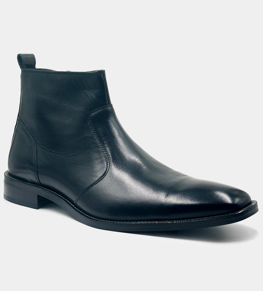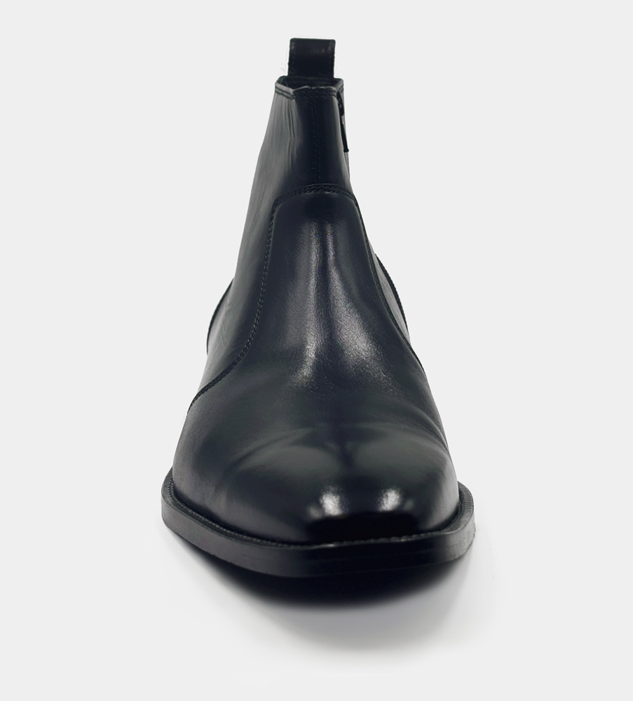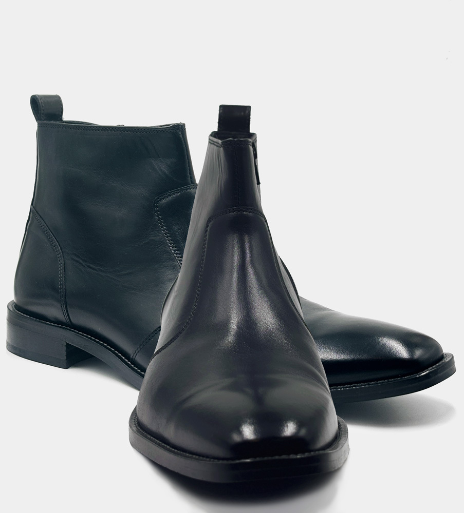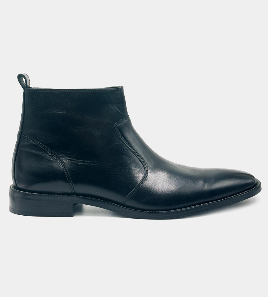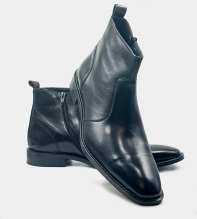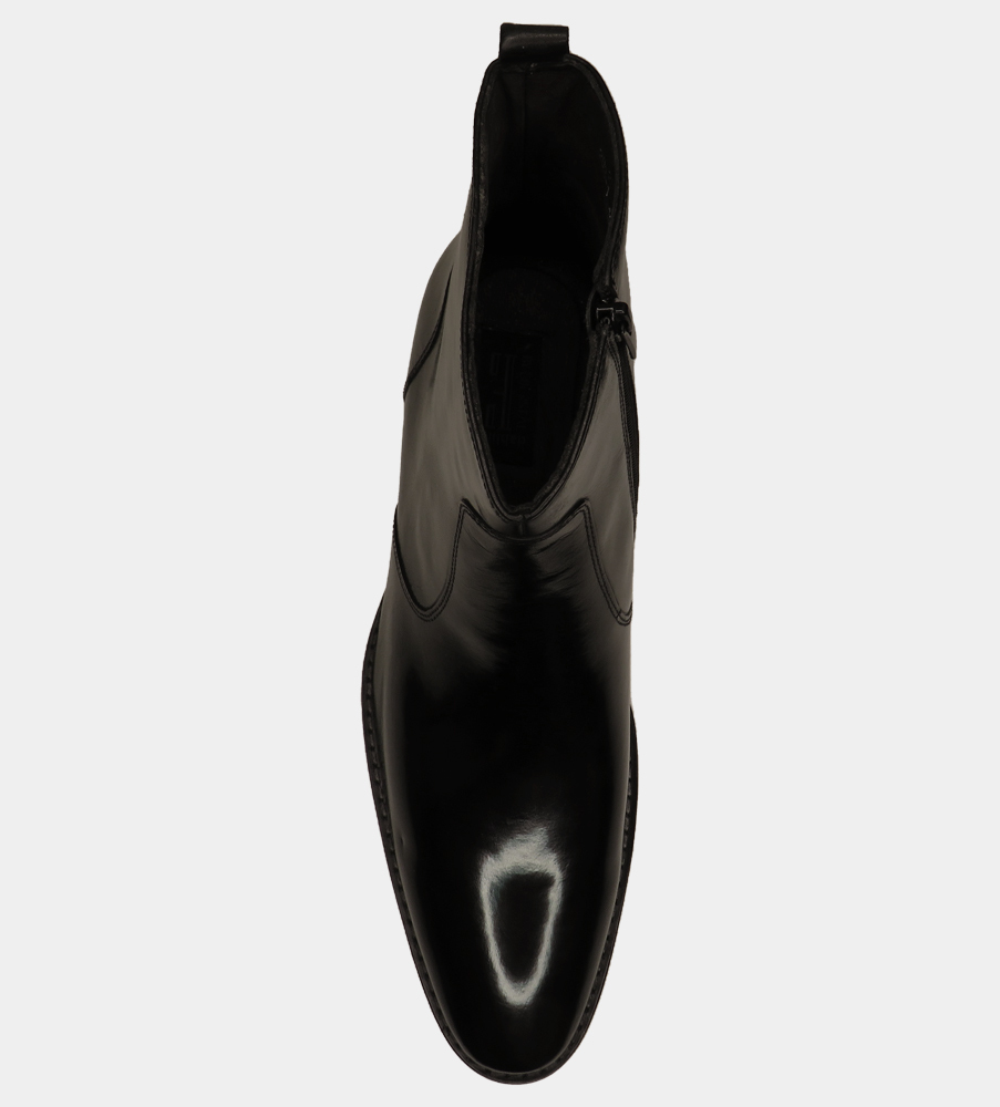 Boots i blankpolerat svart buffelskinn och snygg avsmalnande form. Svart elegant sula med dekorsöm längs kanten. De höga skaft ger ett stilrent utseende. Dragkedja på sidan för smidigt och bekvämt insteg.