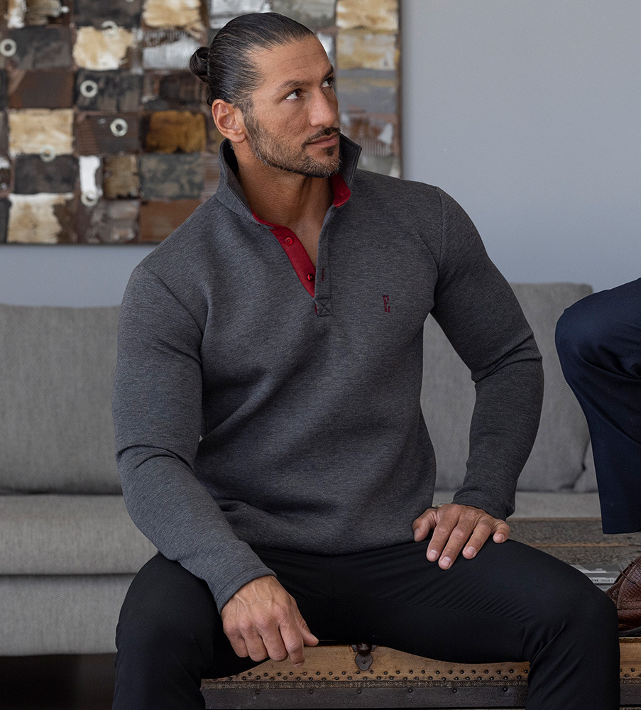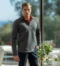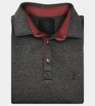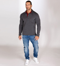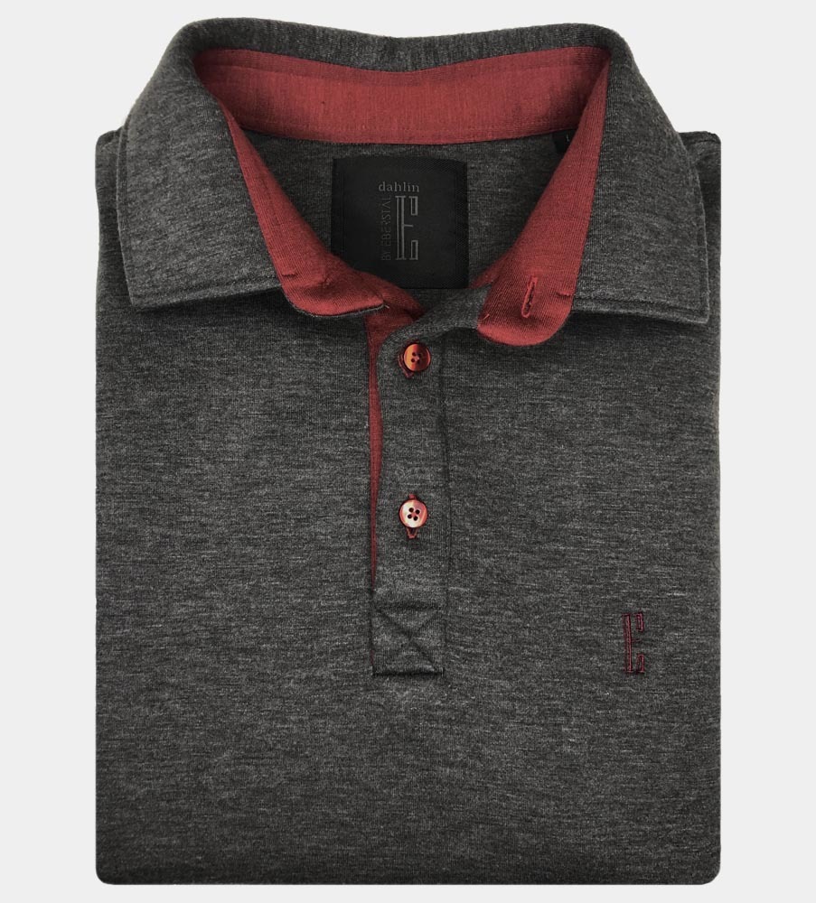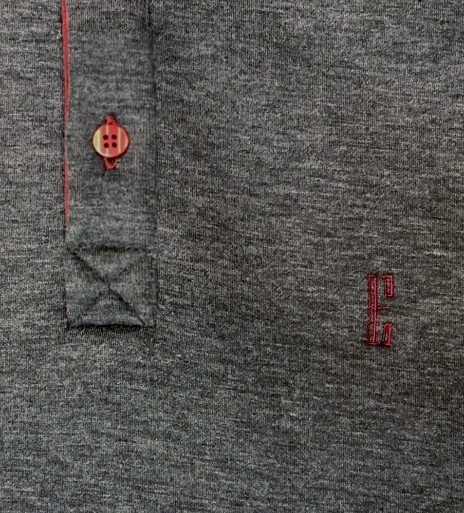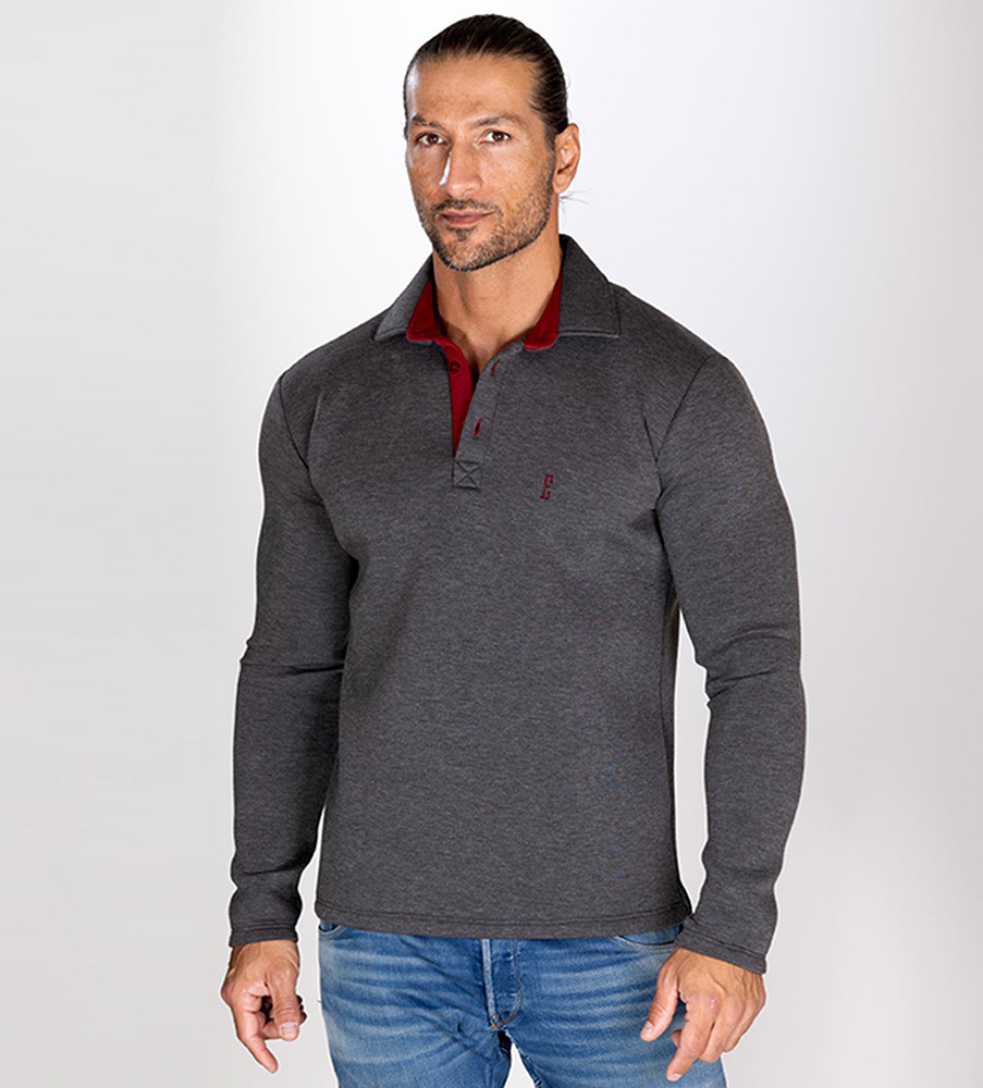 En magiskt skön och snyggt melerade polotröja, uppsydd i ett mjuk kvalitet som måste upplevas. Tyget har en röd insida som syns som en läcker detalj på kragståndets insida och på undre knappslå och som matchar knapparna perfekt. Det läckra tyget faller snyggt och förskönar kroppens form. Tröjans snygga krage och bearbetade detaljer ger dig attityd. Tröjan har en metallkedja för smart upphängning innanför kragståndet. Närproducerad.