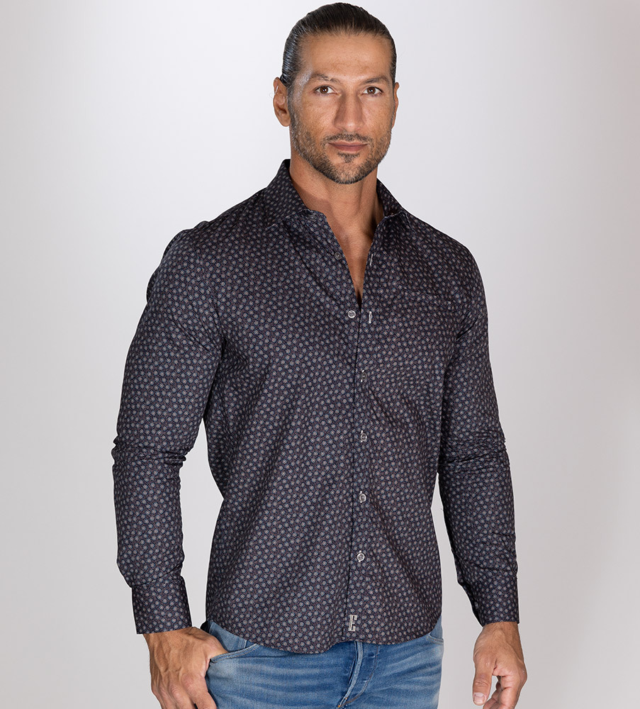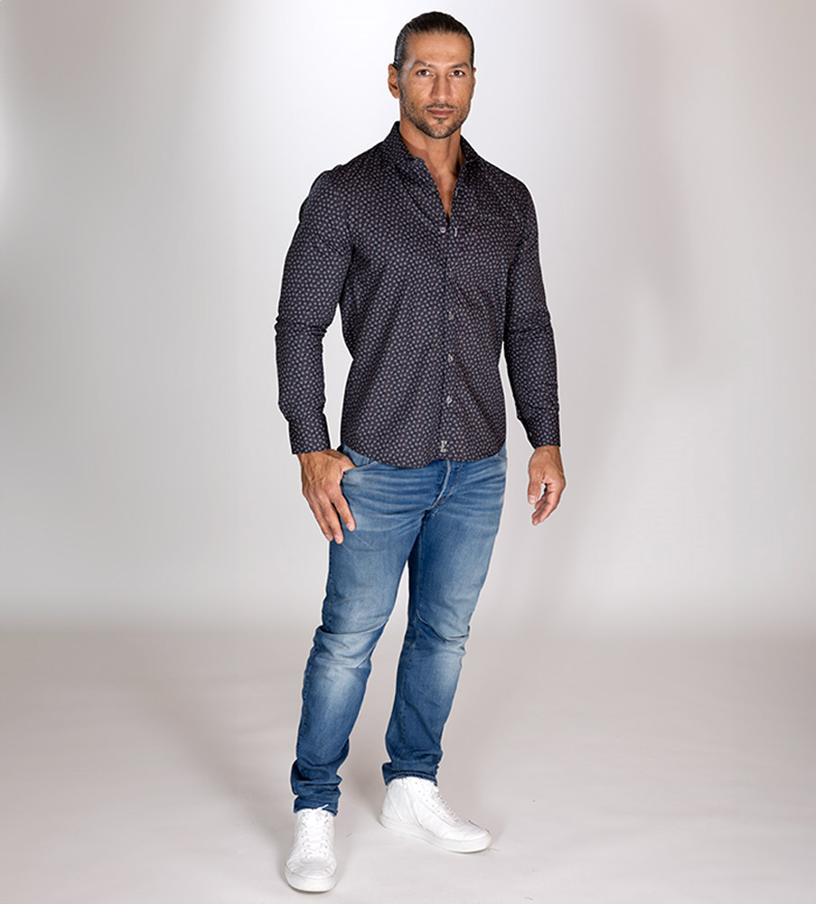 Fräscht, microprintad bomullsväv från Italiensk leverantör för en maskulin look som funkar lika bra på kontoret och affärsmöten som några knappar uppknäppt när det är festligheter på gång. På bröstet finns en fin diskret passpoalficka och knappslån pryds med snygga knappar i grå nyans som lyfter tyget perfekt. Vår signatur är broderad längst ner framtill på skjortan. Tyget har miljömärkning BCI, Better Cotton Initiative samt Oeko-tex. Den sköna ull-blazern på bilden heter Oden >>