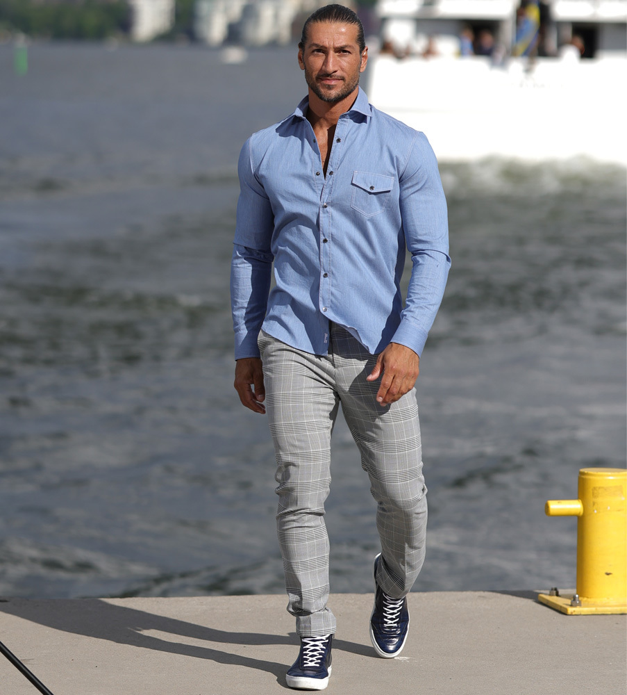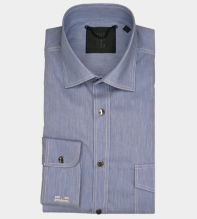 En perfekt, blå skjorta uppsydd i en väv med stretch, tillverkad av ekologisk bomull. Skjortan har designats med dubbelsömmar som ger skjortan en karaktäristisk denim-look. Skjortan har gun-metal-tryckknappar och på bröstet finns en snygg ficka med knapp. Dahlin By Eberståls E-logo-signatur finns broderad på manschetten. Skjortan är något kortare i längd än vår vanliga E-cut, och kan därför med fördel bäras avslappnat utanpå byxorna för den rätta looken. På ryggen under oket finns en locker-loop. Passar alla årstider, både till kavaj eller mjukisbyxor eller som överskjorta. En versatil favorit i garderoben. Matchas snyggt med Pombal sneakers >>