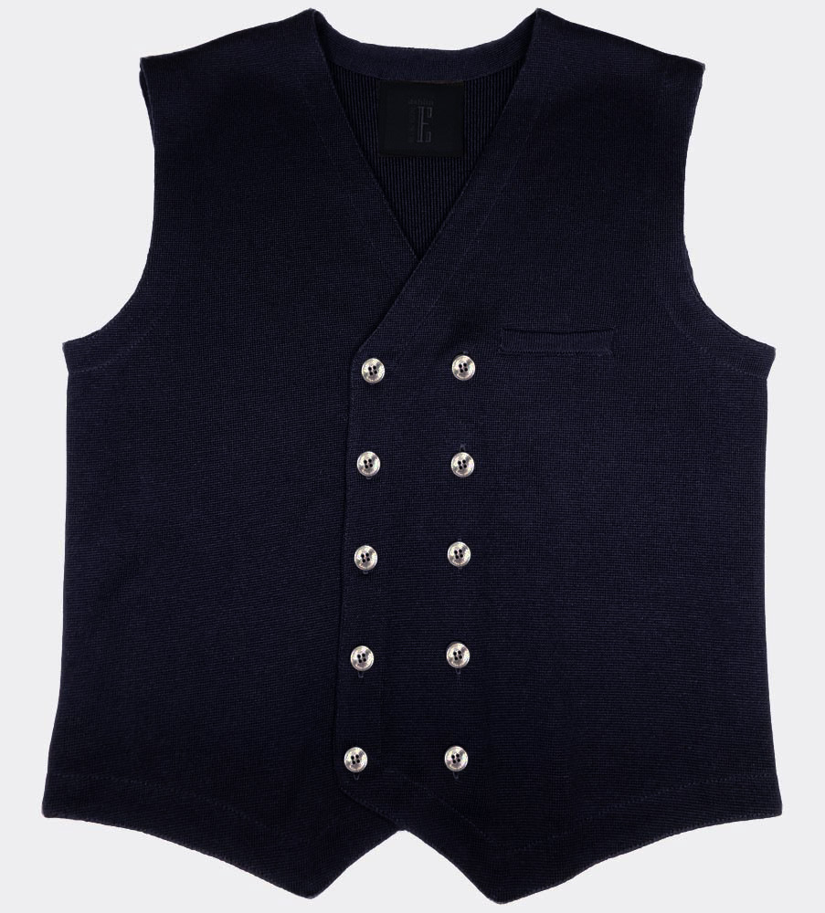 Säsongens stickade väst i marinblå med dubbelknäppning kommer bli en favorit i garderoben! Västen är stickad i 100% bomull med ursprung från Portugal. Tack vare den fina milanostickningen som ger en lyxig känsla och aningen stretchig kvalitet så sitter västen bekvämt och smickrande på kroppen. Västen har designats med en passpoalficka fram på bröstet och vackra grå knappar i pärlemo. Perfekt till att dressa upp på skjortan eller dra på över T-shirten för en mer dressad look. Västen finns i 3 färger: Marin, Nougat och Grafit.
