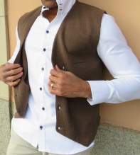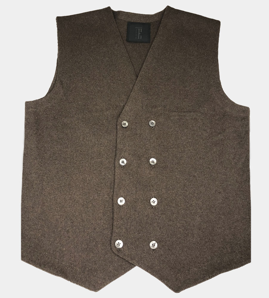 Säsongens stickade väst i brunmelerad nyans med dubbelknäppning kommer bli en favorit i garderoben! Västen är stickad i 100% bomull med ursprung från Portugal. Tack vare den fina milanostickningen som ger en lyxig känsla och aningen stretchig kvalitet så sitter västen bekvämt och smickrande på kroppen. Västen har designats med en passpoalficka fram på bröstet och vackra grå knappar i pärlemo. Perfekt till att dressa upp ovanpå skjortan till säsongen!