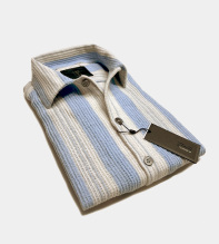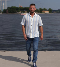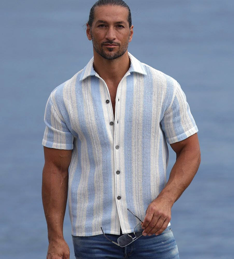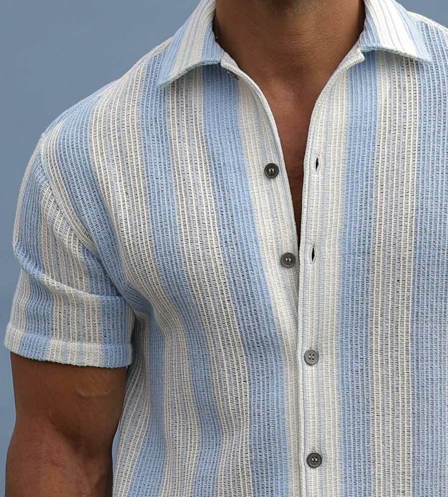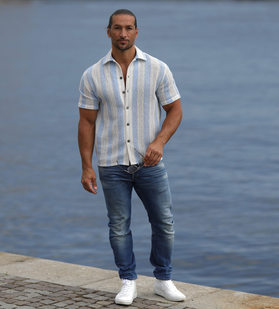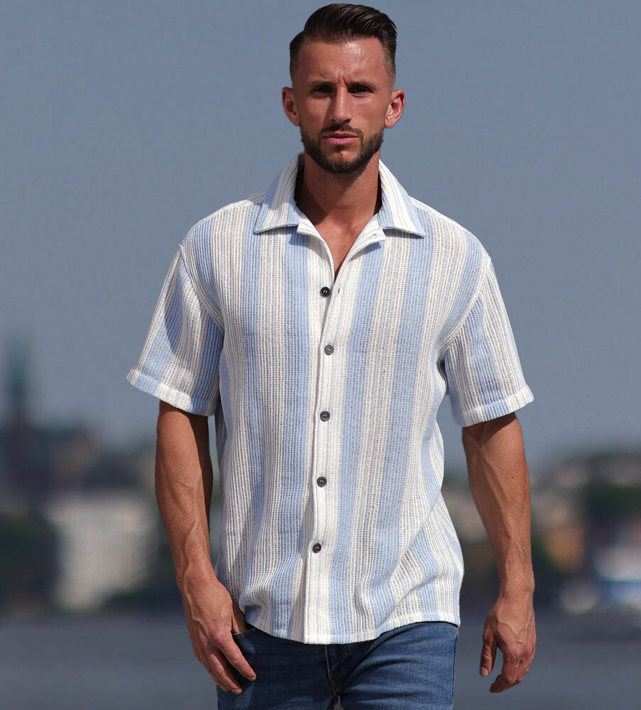 Elevate är en häftig kortärmsskjorta med den italienska rivieran som inspiration! Upplev kombinationen av trendrätt, supermanligt och excellent komfort; allt i ett. Skjortan är uppsydd av en bomull från Italien som ger en härlig struktur. Den kortärmade skjortan är ljusblå-randig, ger en luftig känsla och perfekt komfort och frihet. Knappen är en reproduktion från våra arkiv, i kaxig gunmetal utförande. Skjortan är sydd i en mindre storlek / passform och vi rekommenderar därför att du går upp minst en eller två storlekar för att få den avslappande looken som på en av modellbilderna.