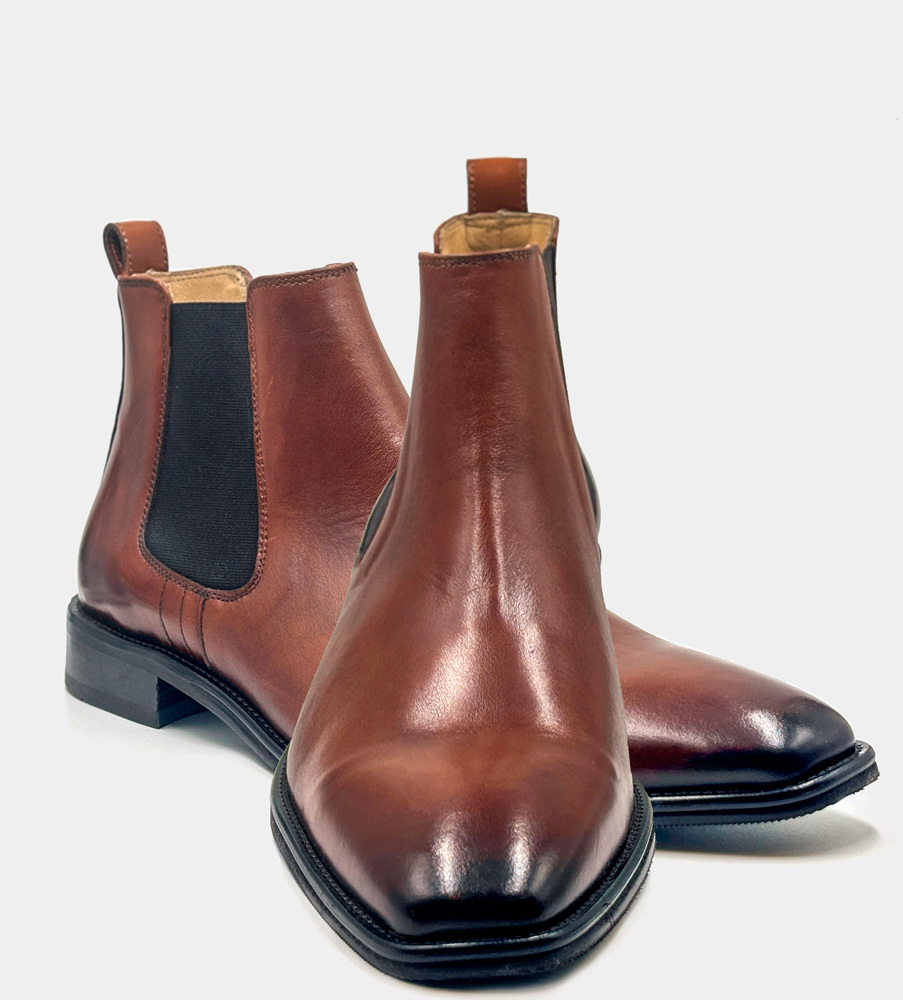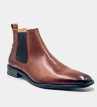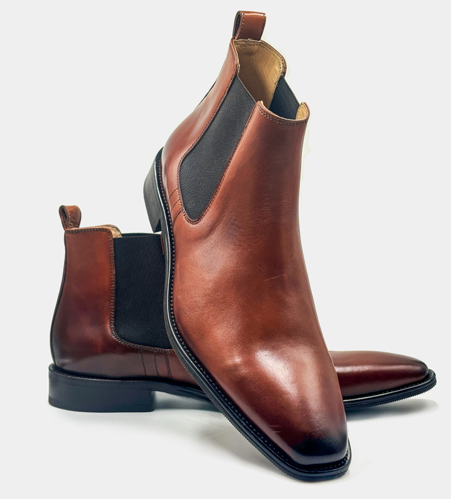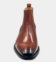 Chelseaboots i brunt polerat buffelskinn och snygg avsmalnade form. Svart elegant sula med dekorsöm längs kanten. Resårer på båda sidor gör att bootsen är smidiga att ta på. Graverat E på skaftet som signatur för en kvalitetssko från Dahlin by Eberstål.