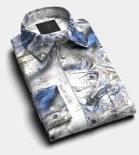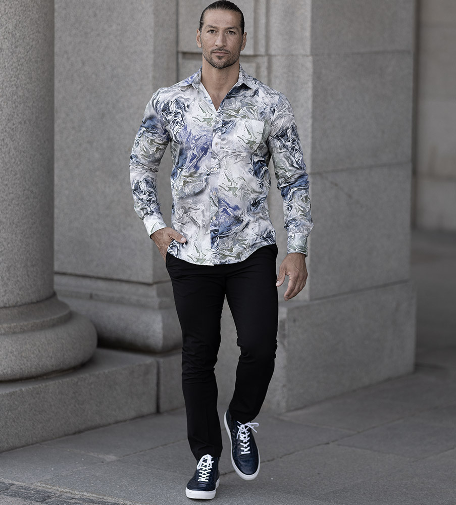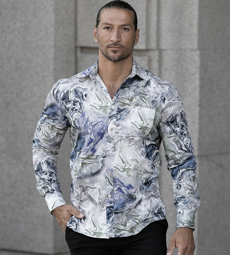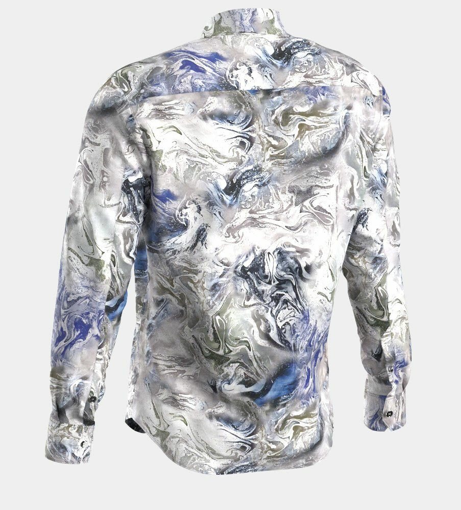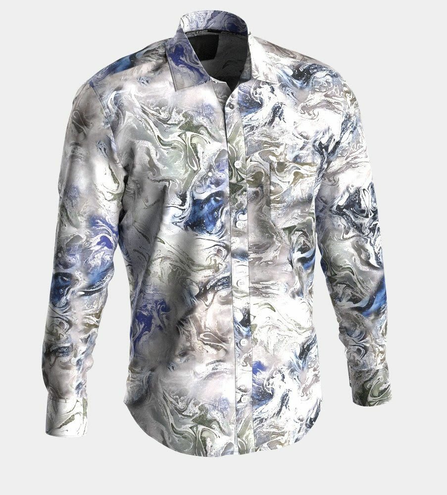 Här har du Grand Bleu en skön skjorta i ett fabulöst tyg som håller dig snygg hela dagen. Passar bra att bäras avslappnat med fållen utanpå byxorna. Mönstret är imaginärt av vågor, himmel och drömmar som du kommer realisera. En stjärna till skjorta som passar både på festen och på stan. Skjortan har häftiga metallknappar från arkivet. Tyget är en toile, certifierad OEKOtex, tillverkad och vävd i Frankrike. Nominerad till årets häftigaste print!