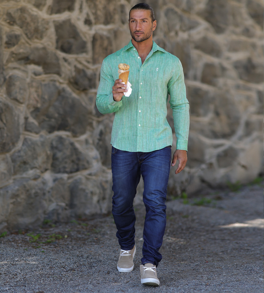 Ingen sommar utan den klassiska linneskjortan! Helst en i varje färg! Denna gröna linneskjortas väv har delikata, små invävda färgtrådar i strukturen, logoknappar på knappslået och bröstet pryds av E brodyr. Dahlin By Eberståls linneskjorta finns i flera härliga färger för att passa alla tillfällen, både till fest och sköna lediga dagar. Linneskjortan är uppsydd i E-cut av en extrafin kvalitet av linne odlat i Normandie, spunnet i Slovenien. Färgat & vävt i Portugal. Detta linne odlas utan bekämpningsmedel i fuktiga miljöer och är ett excellent miljöval. Linneskjortan finns även i grönsandfärg, rosa, blå och vaniljvitt >>
