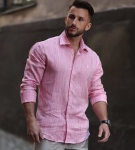 Ingen sommar utan den klassiska linneskjortan! Helst en i varje färg! Denna rosa linneskjortans väv har delikata, små invävda färgtrådar i strukturen, logoknappar på knappslået och bröstet pryds av en snygg E brodyr. Dahlin By Eberståls linneskjorta finns i flera härliga färger för att passa alla tillfällen, både till fest och sköna lediga dagar. Linneskjortan är uppsydd av en extrafin kvalitet av linne odlat i Normandie, spunnet i Slovenien. Färgat & vävt i Portugal. Detta linne odlas utan bekämpningsmedel i fuktiga miljöer och är ett excellent miljöval. Linneskjortan finns även i vaniljvit, grön, rosa, sandbeige och ljusblå nyanser >>