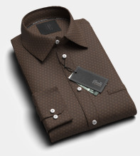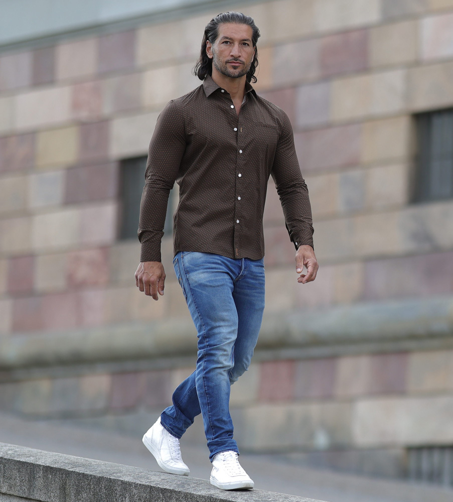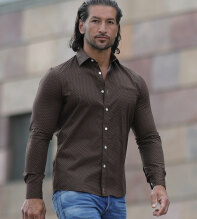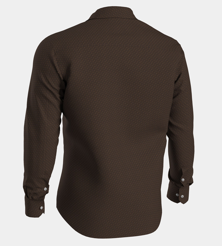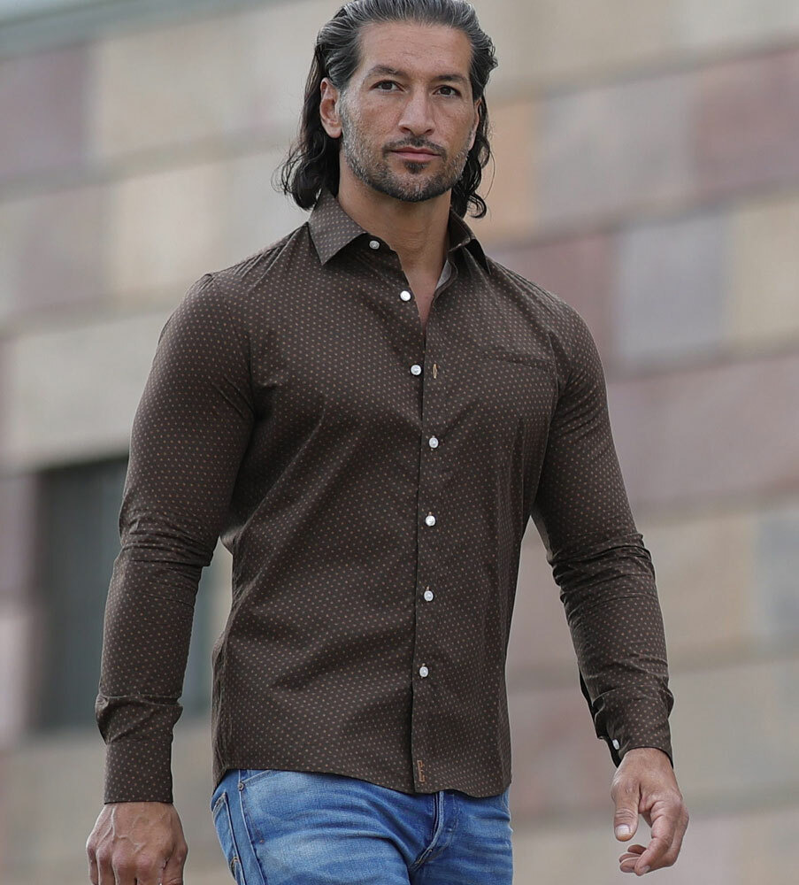 Här har du en underbar höstskjorta i trendrätt brunt micromönster med fina detaljer. Skjortan är uppsydd i en italiensk bomullspoplin med ett blommigt tryck i höstens come-back känsla. Skjortan har en diskret passpoalfick, pärlemoskimrande logo-knappar, rundade manschetter och en amerikansk knappslå. Bär skjortan på kontoret eller några knappar uppknäppt till festmiddagar och partynights.