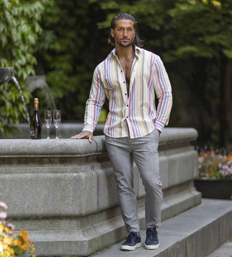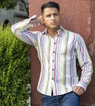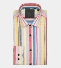 En skön linneskjorta med slimmande linjer i regnbågens sköna färger. Skjortan med sina solblekta färger sprider positiva vibbar. Linneskjortan passar perfekt till vita byxor, chinos eller jeans, speciellt under sommarens soliga dagar. Lin är en fantastisk kvalitet som andas väl och håller dig cool under sommarens skönaste dagar. Linet (råvaran) i våra linneskjortor har självrengörande egenskaper och skjortan kan därför tillåtas vara lite lagom skrynklig för ett ledigt uttryck så länge den känns fräsch. Skjortan har en brodyr bak på kragen med Dahlin By Eberståls ikoniska E. Linet i denna linneskjorta är odlat i Europa. MILJÖMÄRKNING: Oeko-tex + Närproducerad