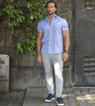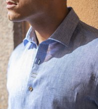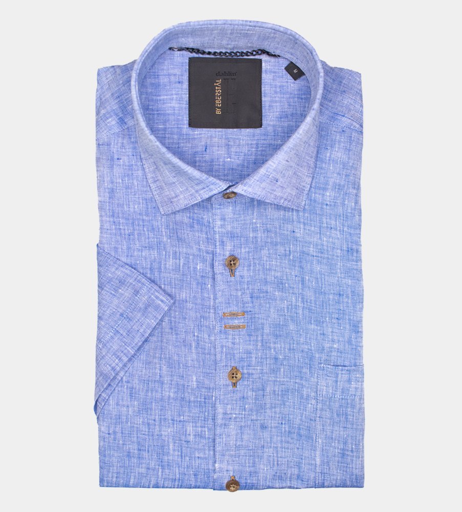 En kortärmad, blå linneskjorta för somriga dagar. Två dekorativa, horisontella knapphåll på knappslået är anpassade för att hänga solglasögonen i. På vardera sidan om ärm och axelsömmen finns en dekorativ detaljsöm i matchande färg till de träfärgade knapparna. Passar perfekt med några knappar uppknäppt på grillfesten med en merinoulltröja över axlarna. Passformen är ledig och avslappnad för en attraktiv känsla. Linet (råvaran) i våra linneskjortor har självrengörande egenskaper och skjortan kan därför tillåtas vara lite lagom skrynklig för ett ledigt uttryck så länge den känns fräsch. Miljövänligt när den tvättas mer sällan och dessutom har lång hållbarhet. Vi kan lova att detta kommer bli din favoritskjorta flera år i rad. Tvättråd: 40 grader maskintvätt. MILJÖMÄRKNING: Oeko-tex + Närproducerad