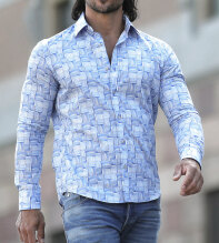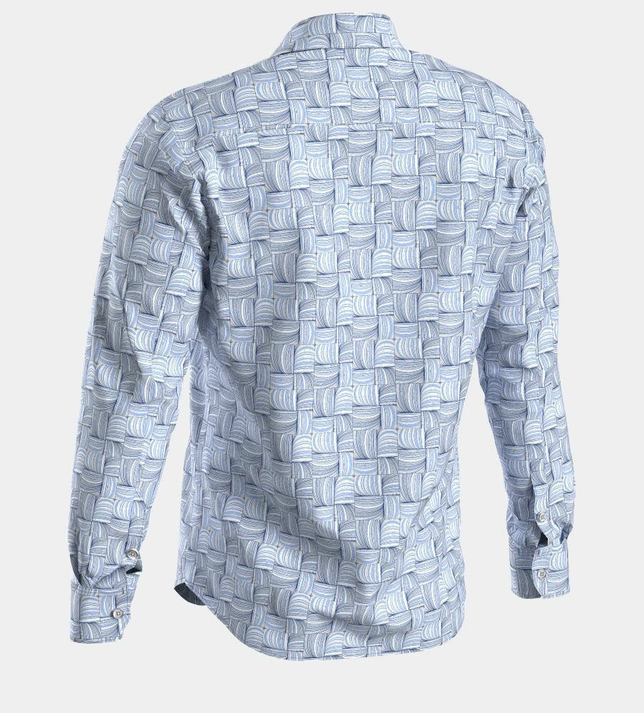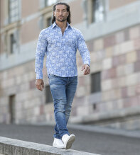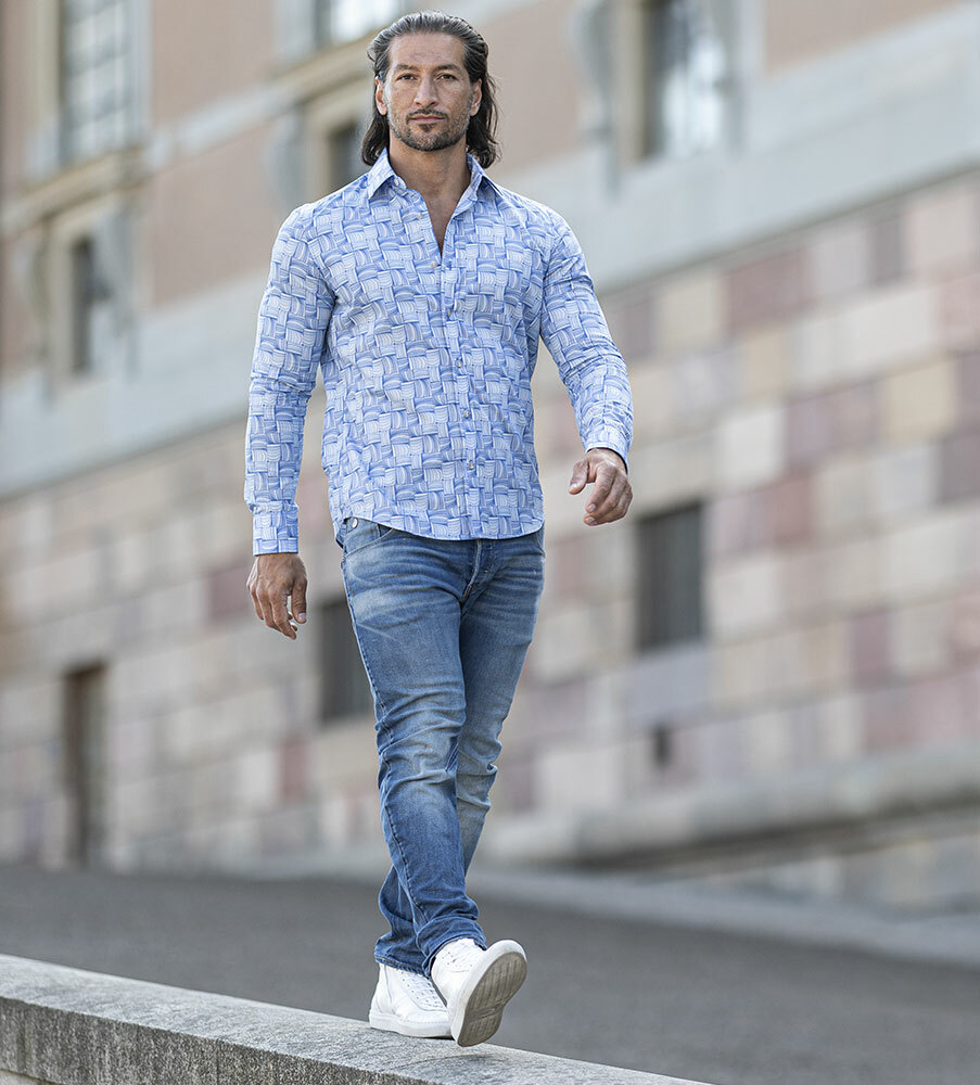 Här har du vår populära skjorta i årets mest ikoniska mönster, i säsongens blå trendfärg. Skjortan är uppsydd i en fin bomullspoplin från Italien. Trycket är ett maskulint kvadratiskt mönster med mycket attityd och stilkänsla. Skjortan är lätt att klä upp eller ner vilket gör den till den perfekta festskjortan.