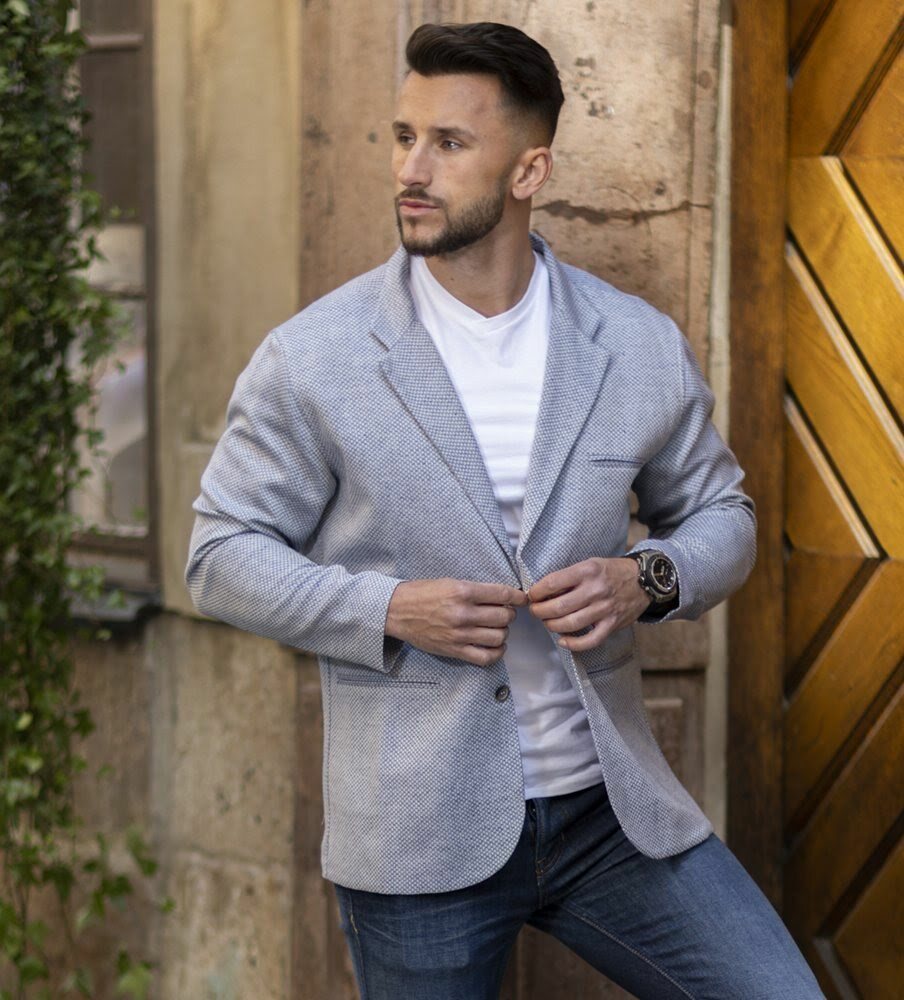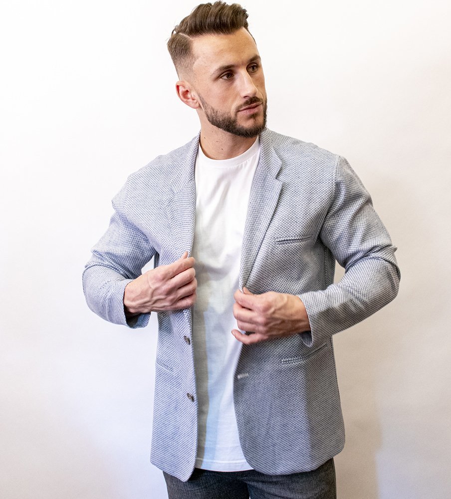 En lätt och ledig blazer i linne-bomullsmix med perfekt placerade framfickor. Blazern är vävd i dobby där garnet har olika ljusa blå färgnyanser vilket ger en skön känsla till din stil. Blazern passar bra till vardags och fest, men även på kontoret eller som ytterplagg på ljumma sommarkvällar. Snygg både till jeans och chinos. Tyget är spunnet, färgat och vävt i Italien. Innanför kragen finns en metallkedja som medger att blazern lätt kan hängas upp. Finns även i beige melange blazer>>