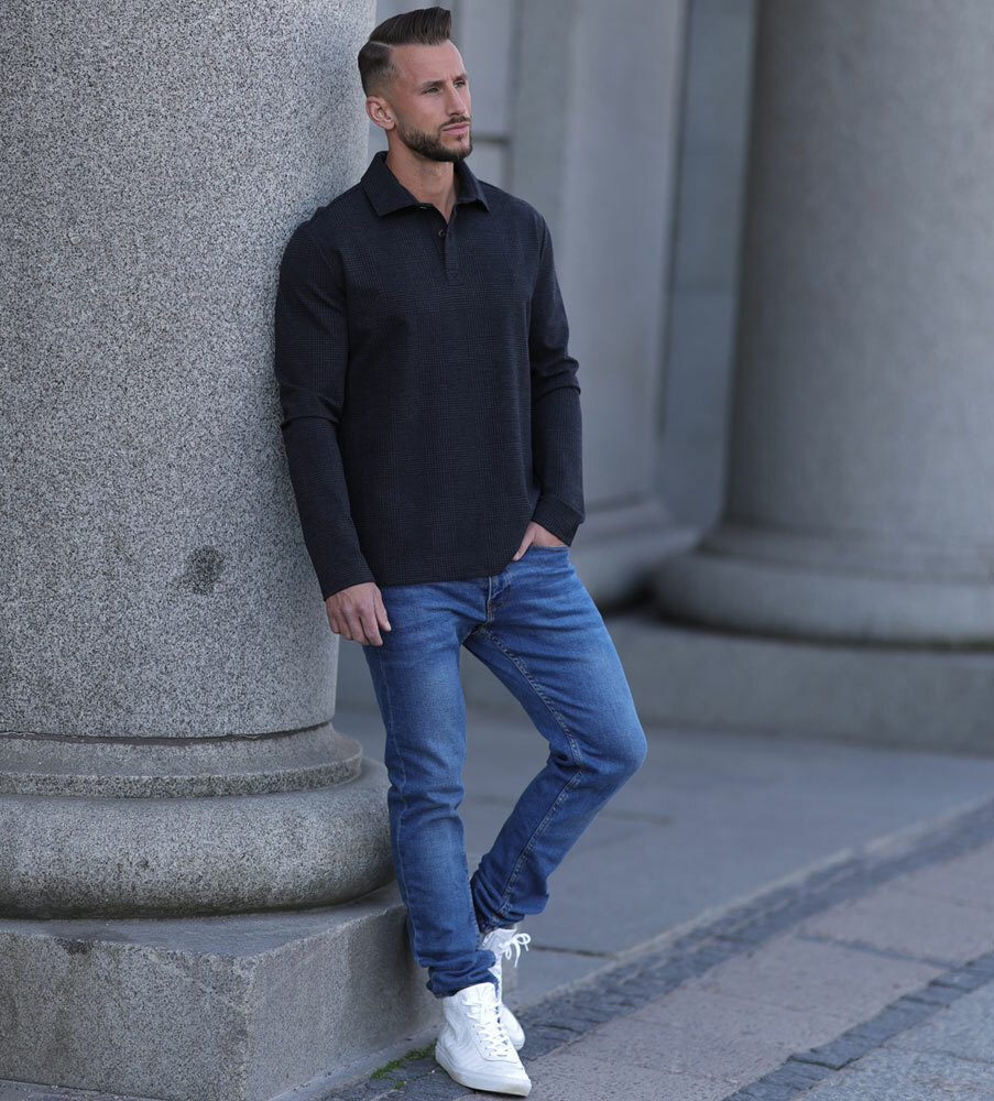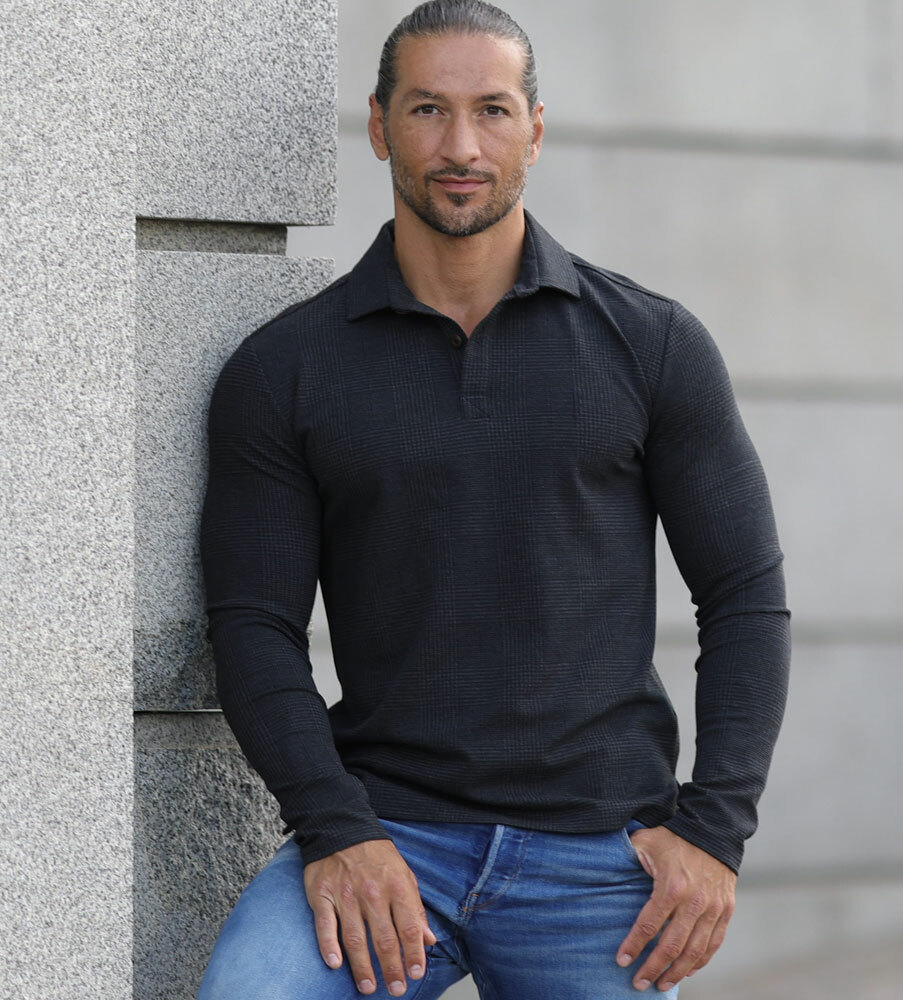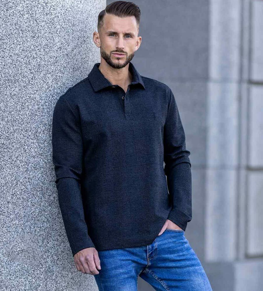 En attraktiv polo-shirt i vår utomordentligt sköna kvalitet som ger dig kunglig lyx och avväpnande charm. Tröjan är uppsydd i ett grått tyg med diskret skotskrutig tartan. Kvaliteten är en mix av viskos-elastan från Spanien som hänger snyggt på kroppen. Mäktig tyngd, lagom stretch och perfekt fall. Tröjan har en riktigt snygg krage och två bruna knappar på knappslån. En favorit, att bära alla dagar!