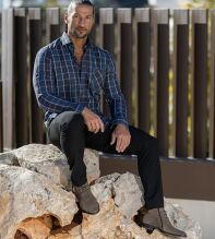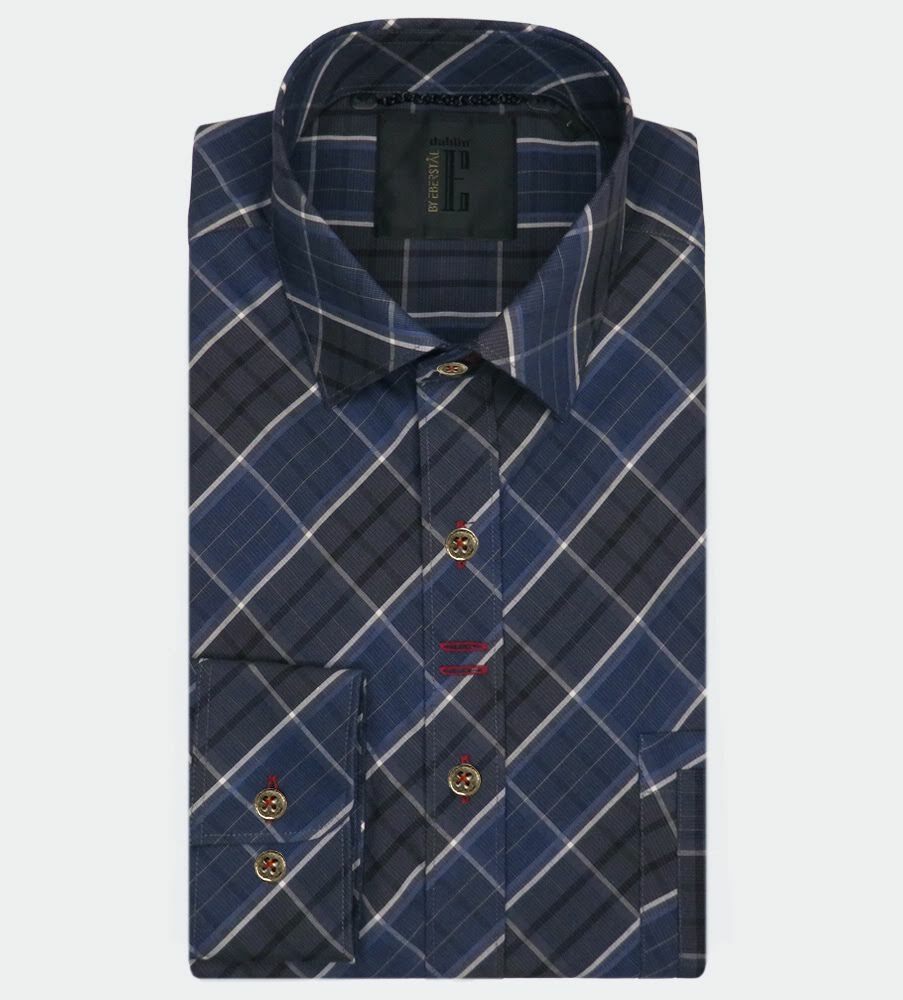 Sapporo Check är en härligt blåbrun skjorta med en extra twist. Skjortans bomulls tyg har ett snyggt rutmönster som designats på skrådden och faller därmed diagonalt över skjortan. Detaljer som skjortans dubbelficka på bröstet, utstickande röda knapphålsfärg, dekorativa knapphål och metallknappar gör skjortan till ett utmärkt val för dig som vill klä dig med attityd och trendsäkerhet. Tyget är i 100% ekologisk Pima-bomull och har odlats i USA som därefter vävts i Österrike av samarbetspartners med höga hållbarhetsstandarder. I kragen finns en metallkedja för smidig upphängning. Perfekt som tillskott i garderoben för säsongen.