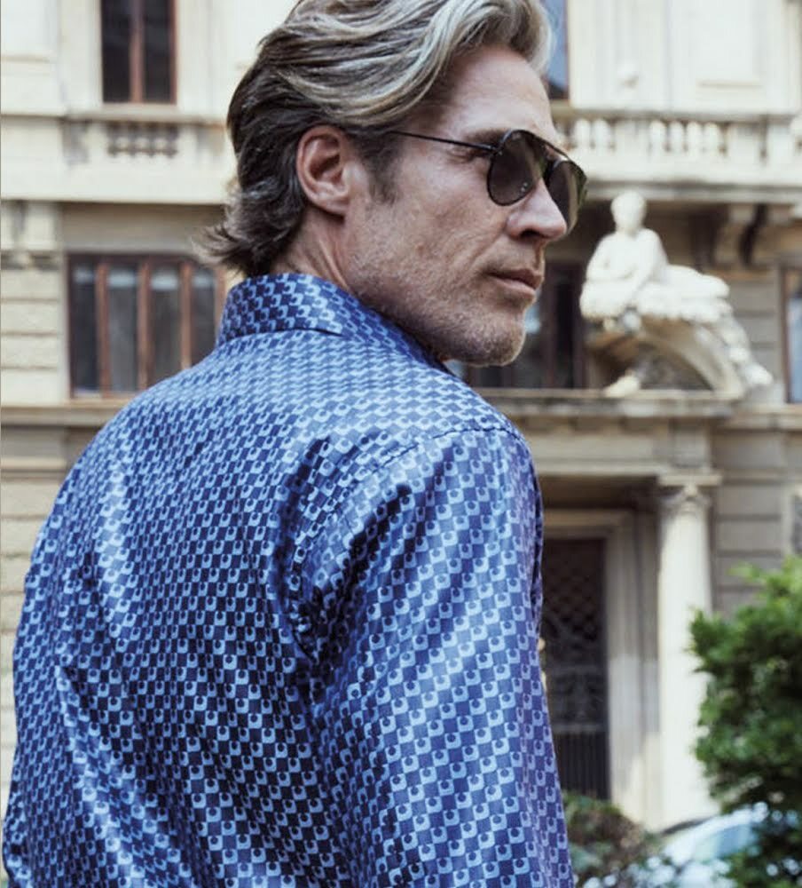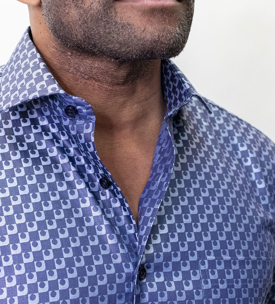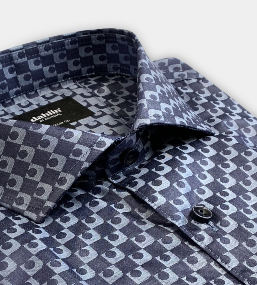En signature skjorta i jaquardvävt bomullstyg i olika nyanser av blått. Jaquardväven är dubbelsidig vilket betyder att färgerna blir spegelvända på baksidan och på skjortans detaljer. Skjortans tyg har ett häftigt mönster med kvadrater och cirklar och dess finish ger en lyxig känsla. Passar perfekt till bruna chinos med ett snyggt bälte eller till kavaj och eleganta byxor. Vi lovar att detta är en skjorta som kommer ge dig många beundrande blickar. Framförallt är det skjortans design och exklusiva kvalitet som sticker ut. Skjortan är hantverksmässigt mönsterpassad, har en bröstficka och cut-away krage samt eleganta djupblå knappar. Tvättråd 40 grader maskintvätt.