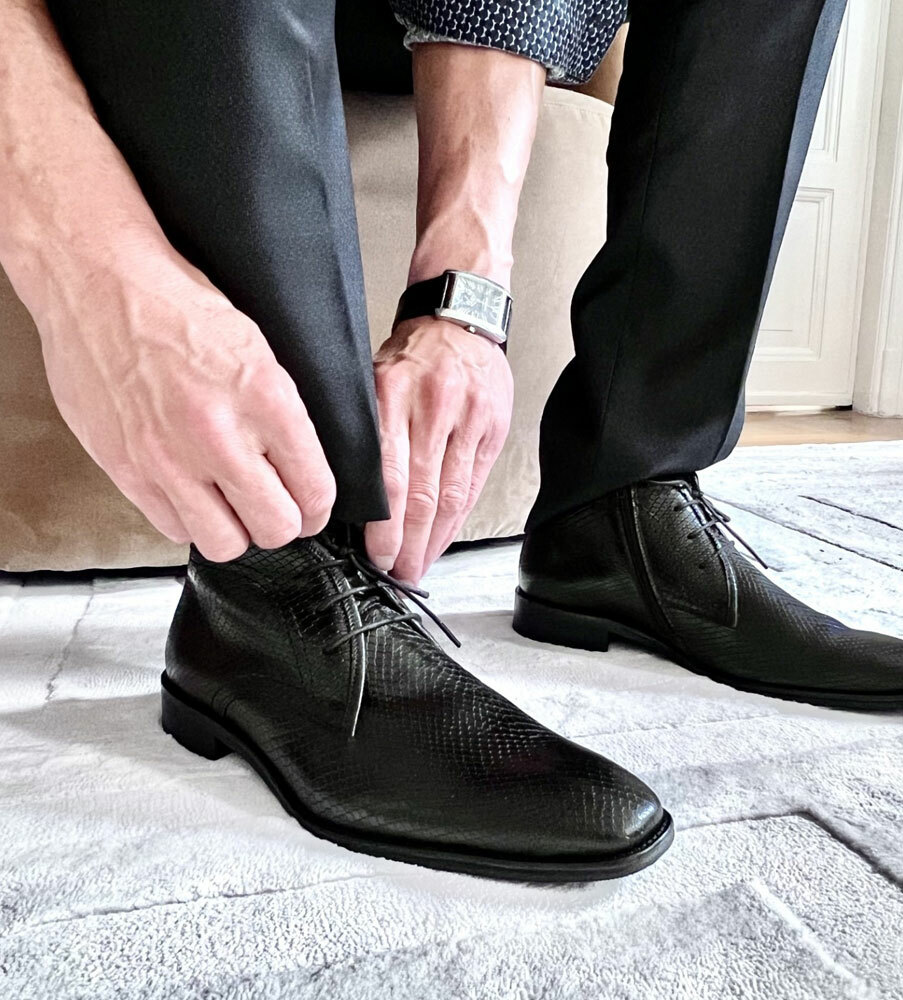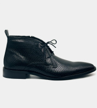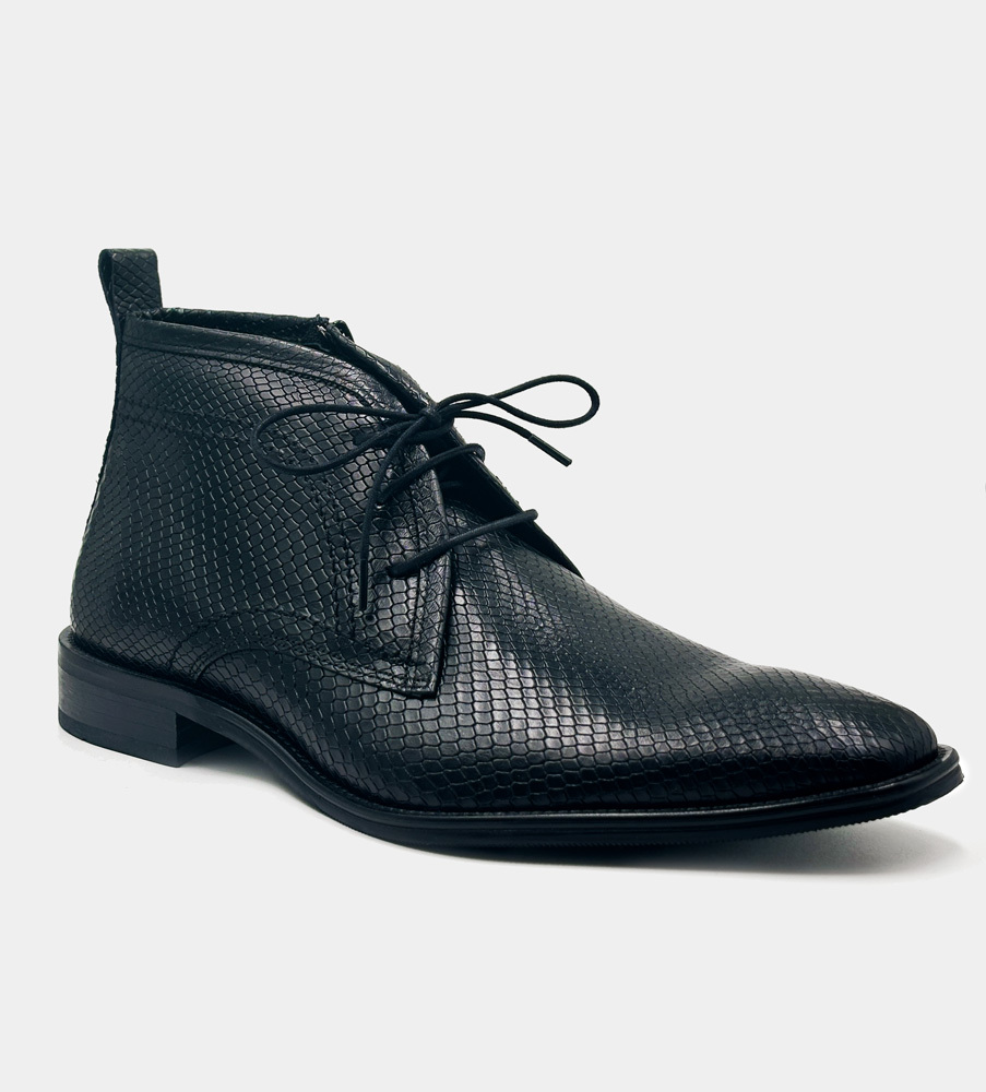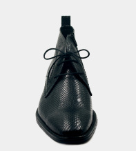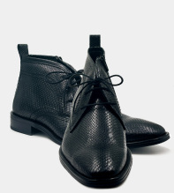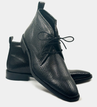 Svarta boots i buffelskinn, präglat med ett ormskinnsmönster. Bootsen har dragkedja i sidan och dessutom skosnören, så det är både enkla att klä på, och sitter perfekt tack vare snörningen. Graverat E bak på hälen. Finns även i brun nyans, Alhambra läderboots >>