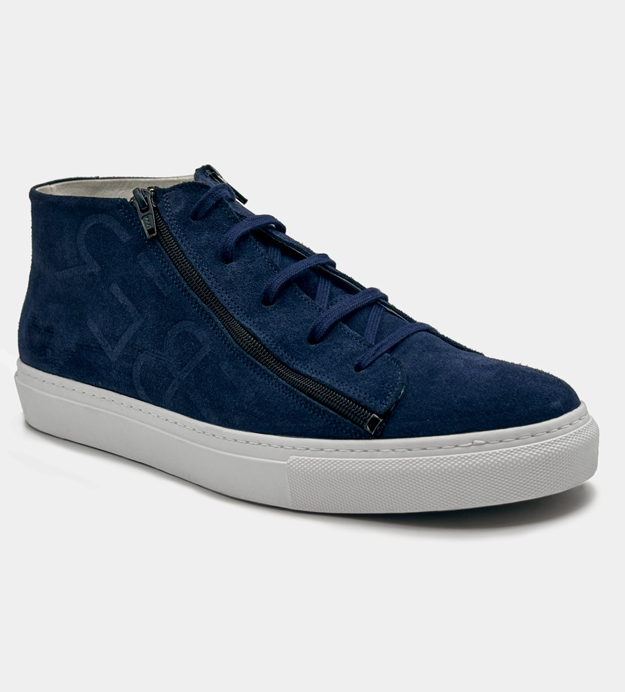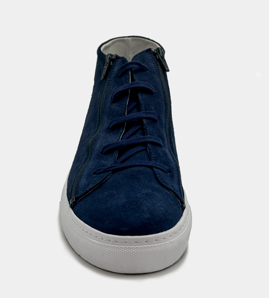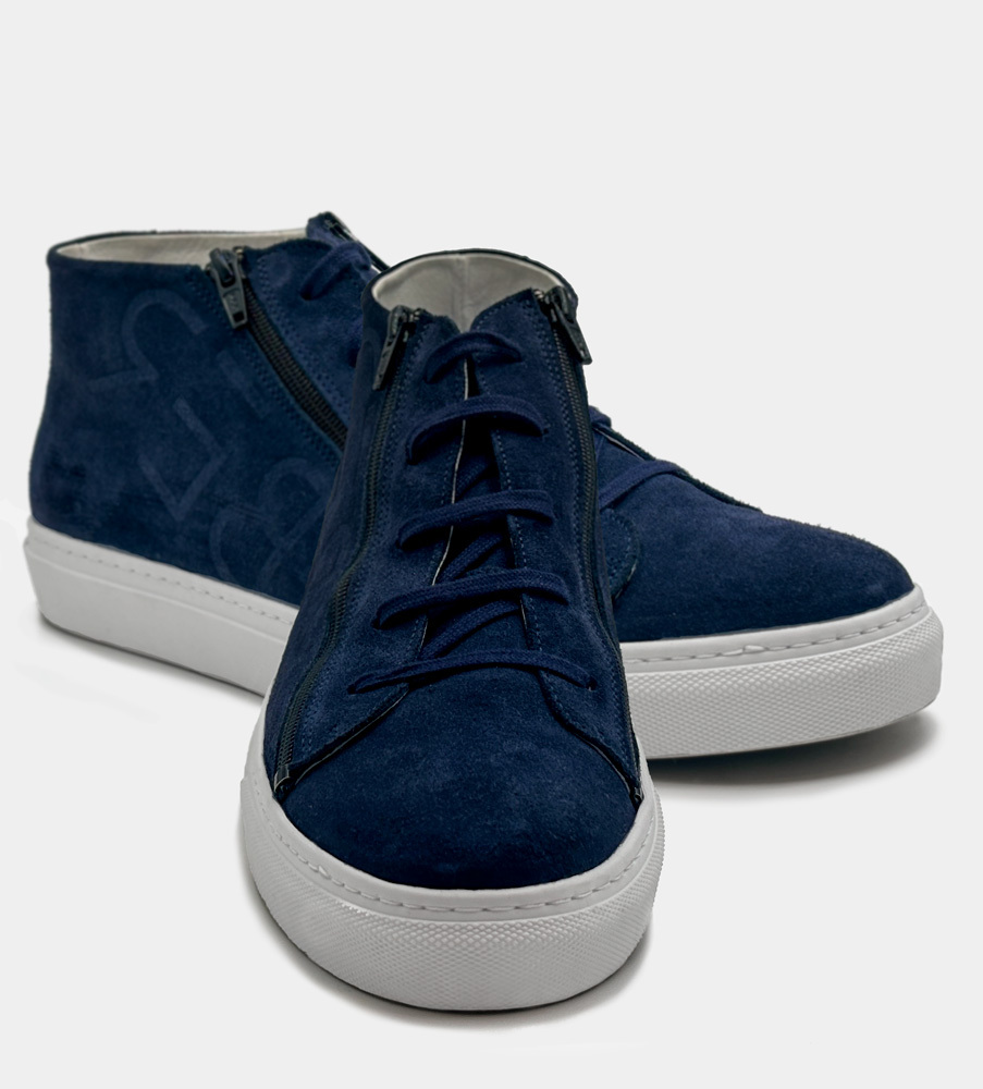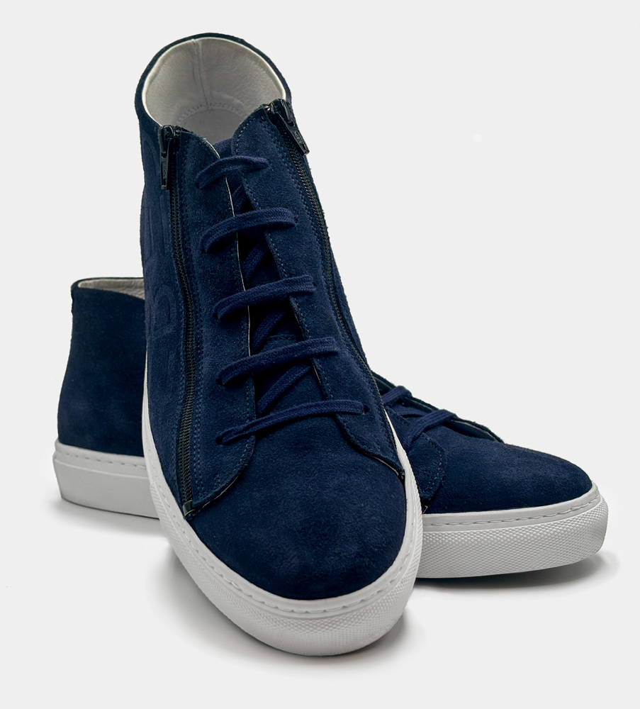 En häftig, hög sneaker i blå mocka, med dragkedjor på båda sidor av snörningen för enkelt insteg och urbant utseende. Dessa blå sneakers är tillverkad i exklusiv italiensk mocka med fina miljörmärkningar och ungdomlig design. En hög sneaker passar bra både till vår och sommar tack vare att både ytter- och innerdelar är av läder/ mocka och andas mycket väl. Skorna har snygga dekordetaljer med präglad logotype på utsidan och har en bekväm passform. Sulan är krispigt vit, tillverkad i gummi för bra grepp och bekväm gång. Ingår två olikfärgade skosnören. Dessa mockasneakers finns i flera färger: brun, blå, beige och sand.
