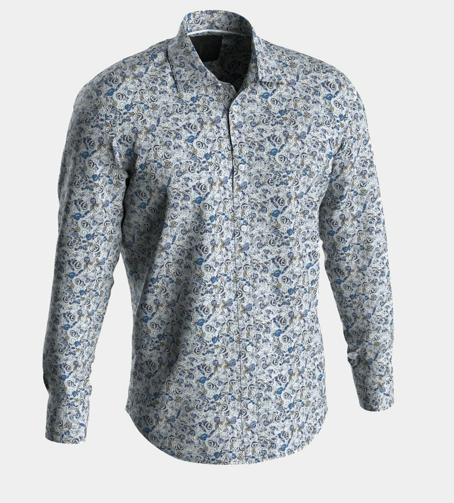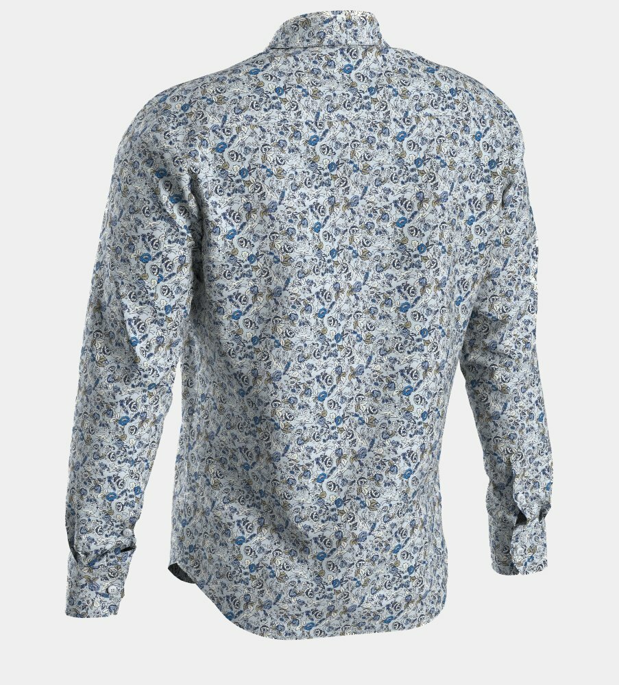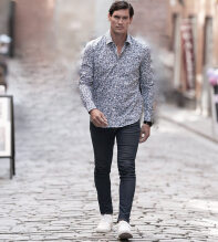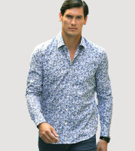 Stardust Flyer är en småmönstrad skjorta i 100% bomullspoplin från Italien, med fina detaljer. På nedre knappslå finns en piping i krispigt vitt som matchar tygets mönster och på bröstet pryds skjortan av en diskret passpoalficka. Skjortan har vita pärlemoskimrande logoknappar. Skjortan passar lika bra till födelsedagsfesten eller till kontoret vilket gör den till den perfekta skjortan.