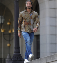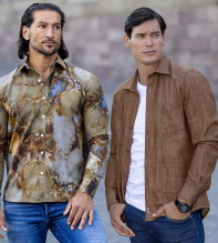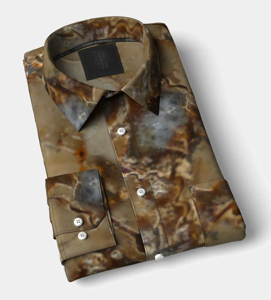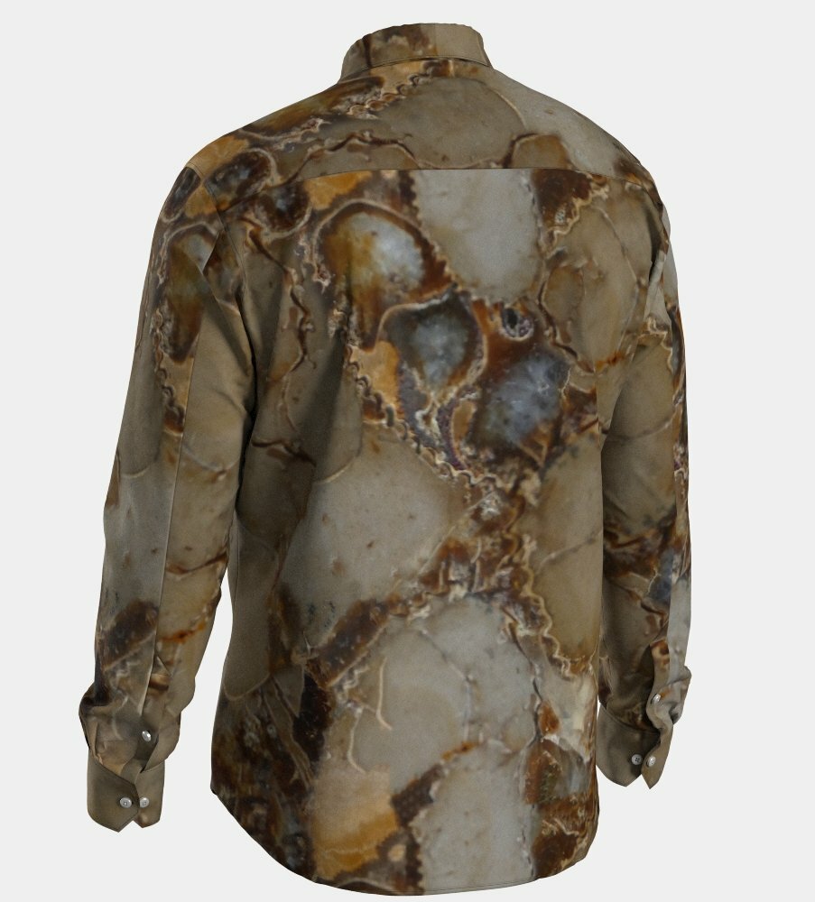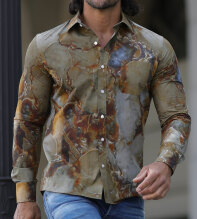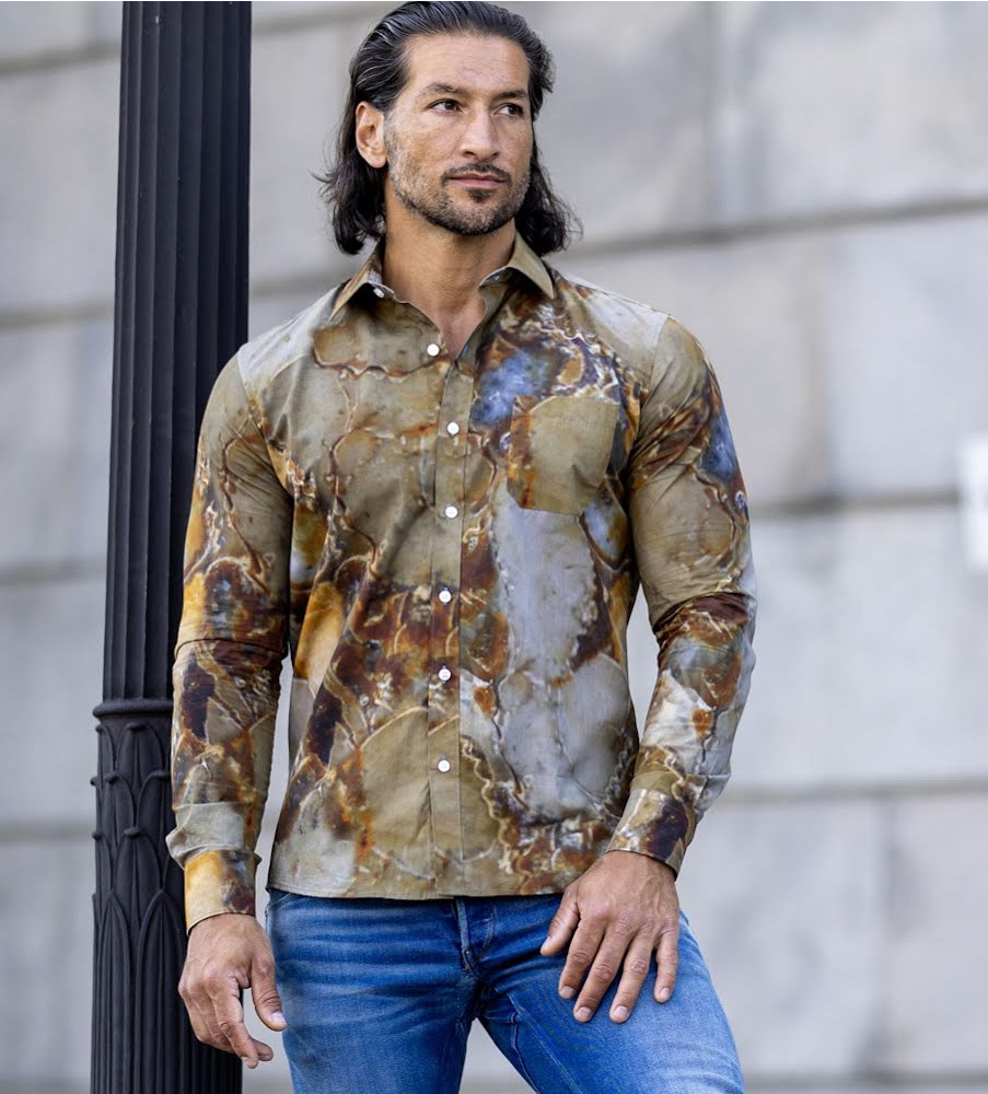 Häftig skjorta i årets trendiga färgskala som garanterat drar blickarna till sig. Tyget är av 100% bomull med vacker finish och trycket har diskreta detaljer i en annars abstrakt vulkanisk och mineralisk mönsterbild. Mönstret är inspirerat av genomskärningen av berg. Tyget är en bomullspoplin från Frankrike med miljömärkningen Oeko-tex, vilket betyder att alla produktionsstegen under tygets tillverkning är gjorda med speciell hänsyn till miljön. Skjortan matchas snyggt med Vibe Copper Jacka >> på bilden.