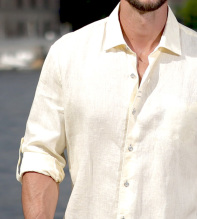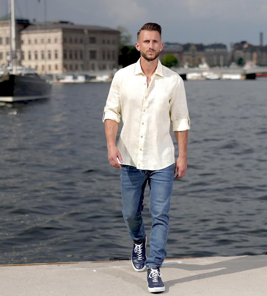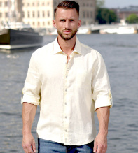 En melerad linneskjorta i citrongula toner för somriga dagar. Två dekorativa, horisontella knapphåll på knappslået är anpassade för att hänga solglasögonen i. Inuti ärmen finns en dold flärp och knapp för smart och stiligt uppvik av ärmen när du så önskar. På nedre knappslå finns en dekorativ detaljsöm i matchande färg till de snygga metallknapparna från arkivet. En signaturbrodyr pryder knapplsåt längst ner. Linneskjortan passar perfekt på grillfesten eller strandpromenaden, med några knappar uppknäppt, med en merinoulltröja över axlarna. Passformen ger dig en manlig, attraktiv look. Linet (råvaran) i våra linneskjortor har självrengörande egenskaper och skjortan kan därför tillåtas vara lite lagom skrynklig för ett ledigt uttryck så länge den känns fräsch. Linet är odlat i Normandie och linneskjortan uppsydd här i Europa. Vi kan lova att detta kommer bli din favoritskjorta flera år i rad. Denna design av linneskjorta finns även i vit, ljusblå, mintgrön, citrongul och orange.