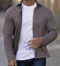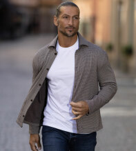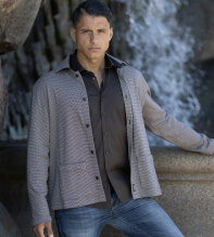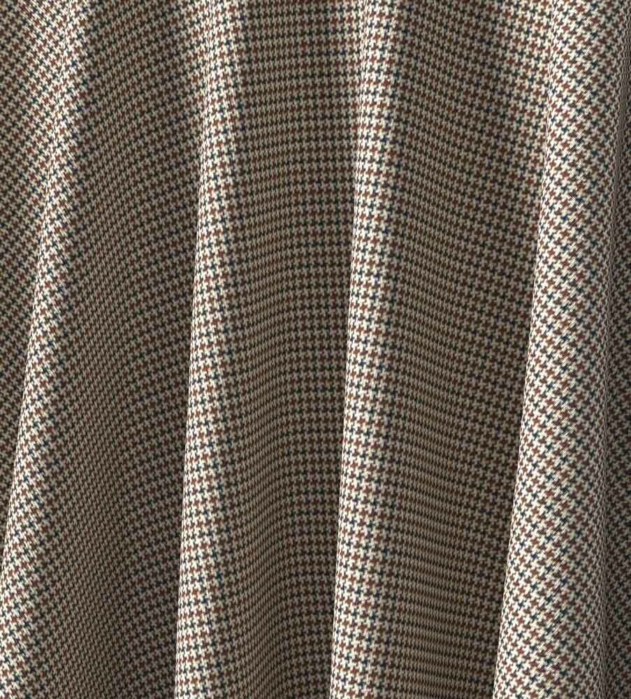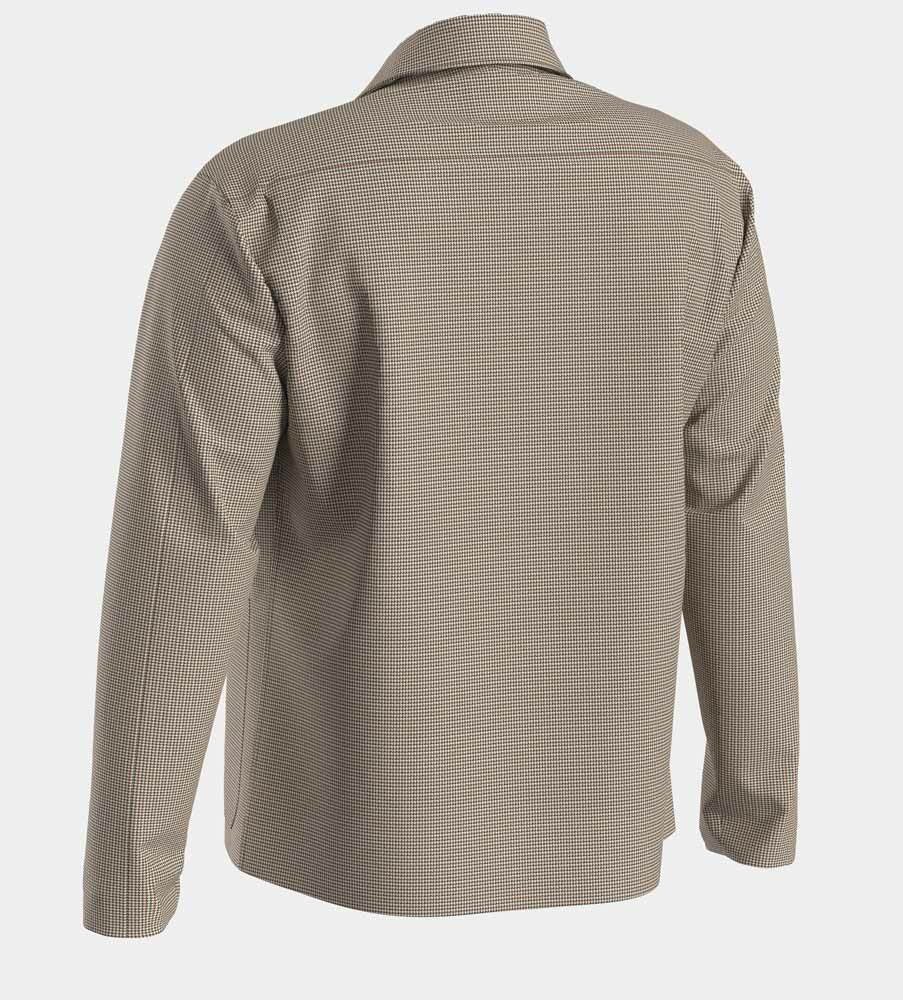 Insidan av kragen pryds av ett WnC läder (konstläder) och en metall-kedja vid innerkragen bidrar med praktisk upphängning. Plagget är uppsytt i ett Portugisiskt hundtandsmönstrat tyg stickat i 100% bomull.