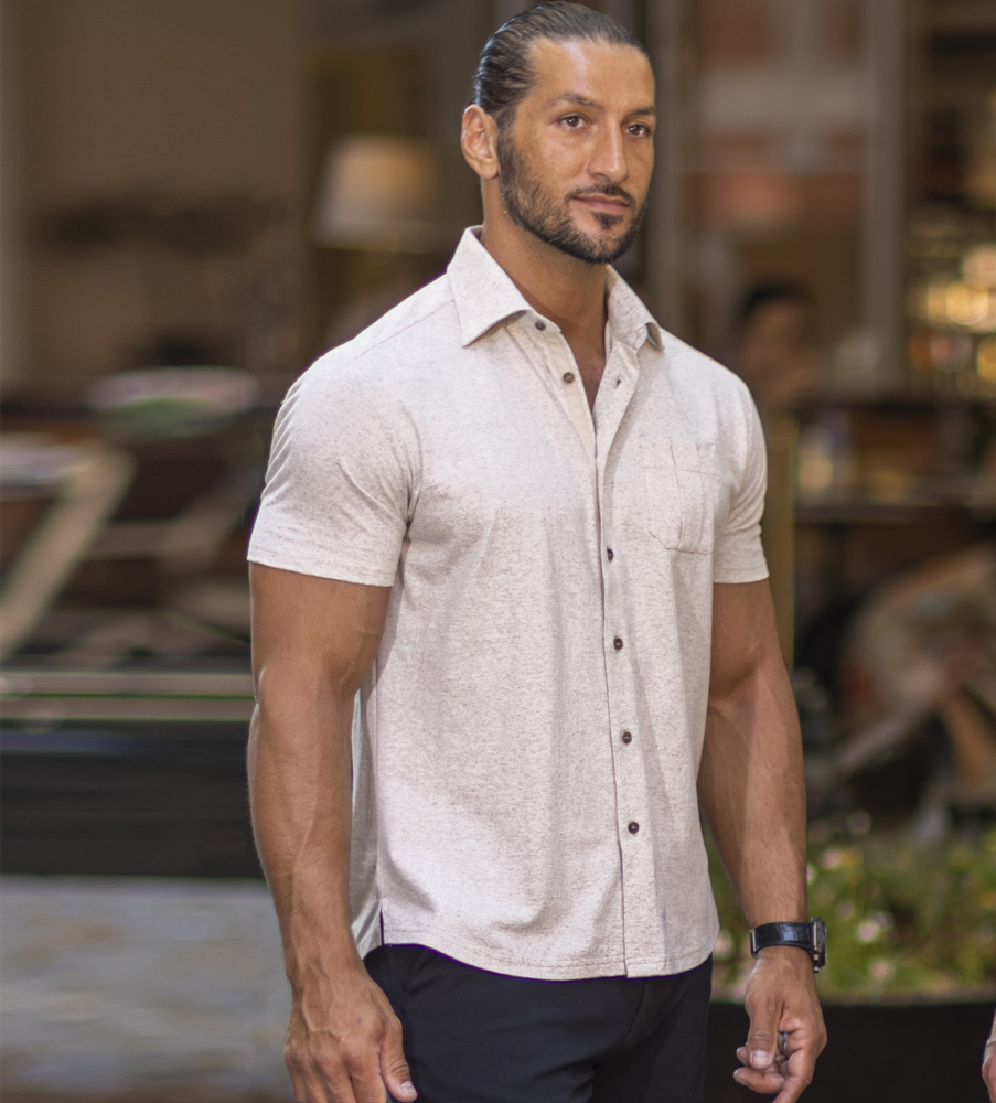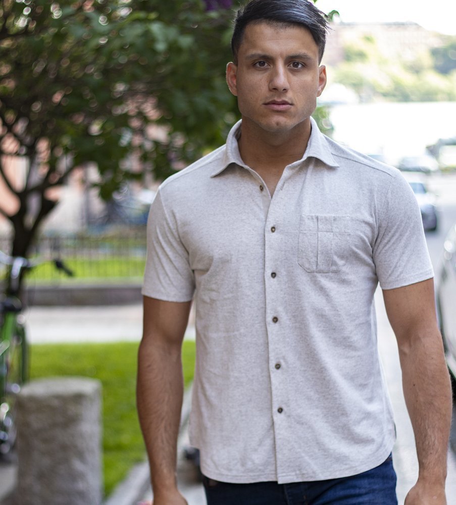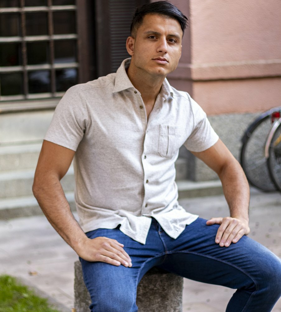 En beige jersey polo med trendrätt, större krage inspirerad av 70-talet. Den lyxigt melerade jerseyn är uppsydd av en blandning av ekologisk bomull och hampa som växt och spunnits i Europa. Skjortan är dessutom stickad & sydd i Litauen. Hampan är en hållbar textilfiber vars odling kräver lite vatten i jämförelse med andra textilfibrer. Den kortärmade ekologiska skjortan har naturfärgade knappar. Fickan på bröstet har ett formveck på mitten med E-brodyr. Snygg och bekväm till chinos eller jeans och ett garanterat topp-notch miljöval. MILJÖMÄRKNING: Närproducerad