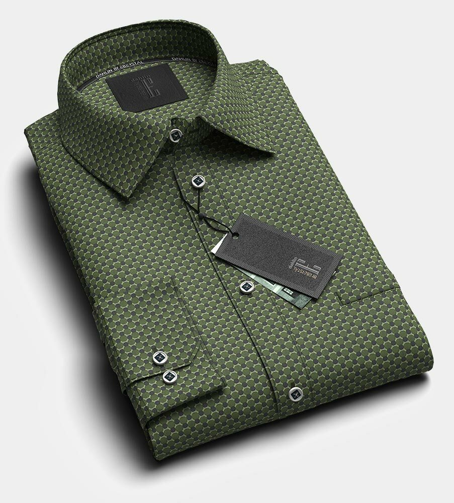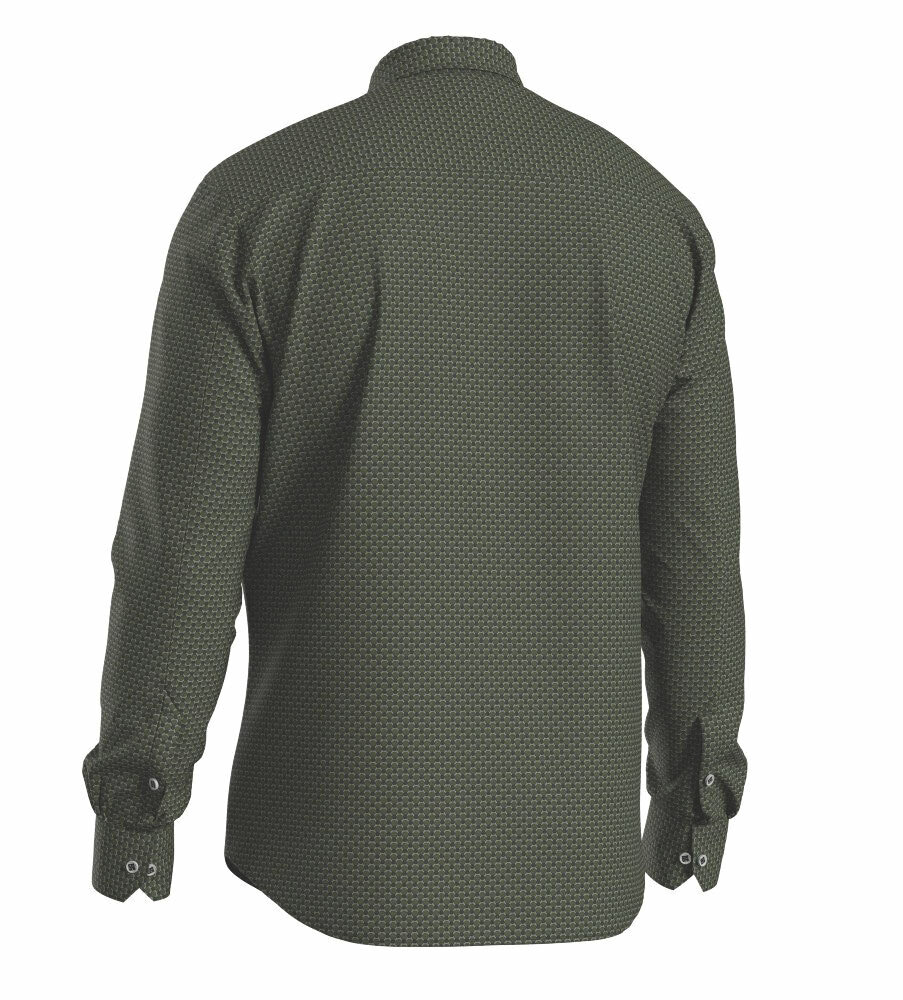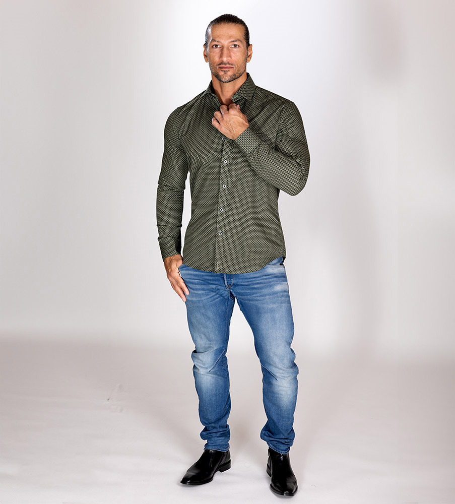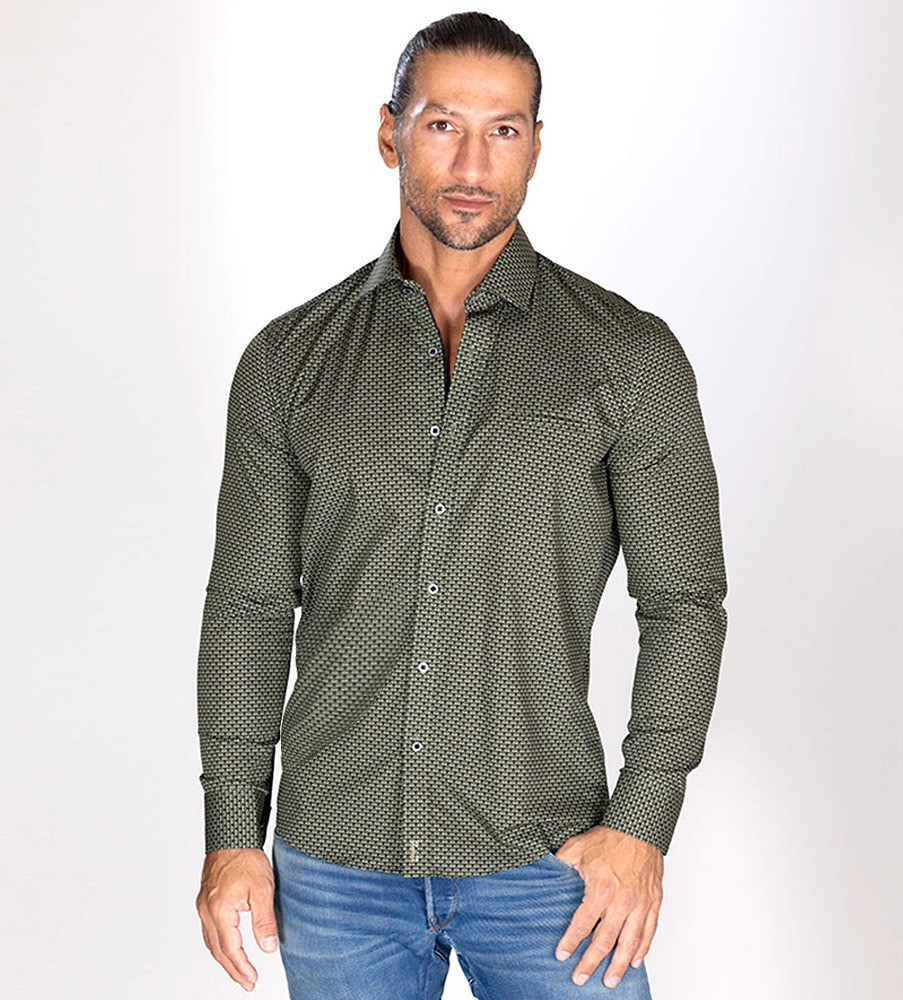 Här har du en fantastiskt skjorta med ett tilltalande cirkelmönster i höstens trendiga gröna färgbild. Tyget är en bomullspoplin och kommer från en italiensk vävare. Skjortan är versatil och passar precis lika bra på kontoret som till mer festliga tillfällen. Skjortan finns i tre olika färgställningar blå, brun och grön.