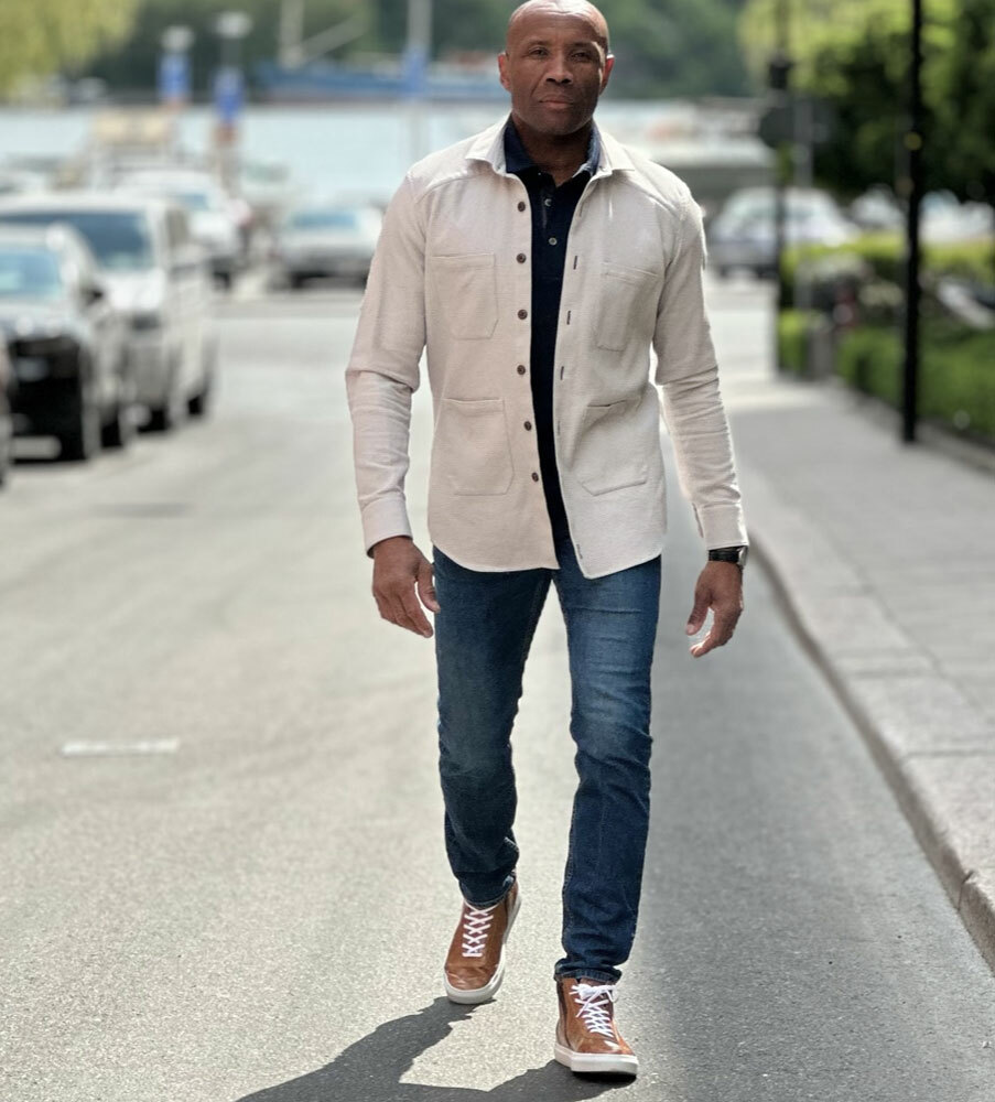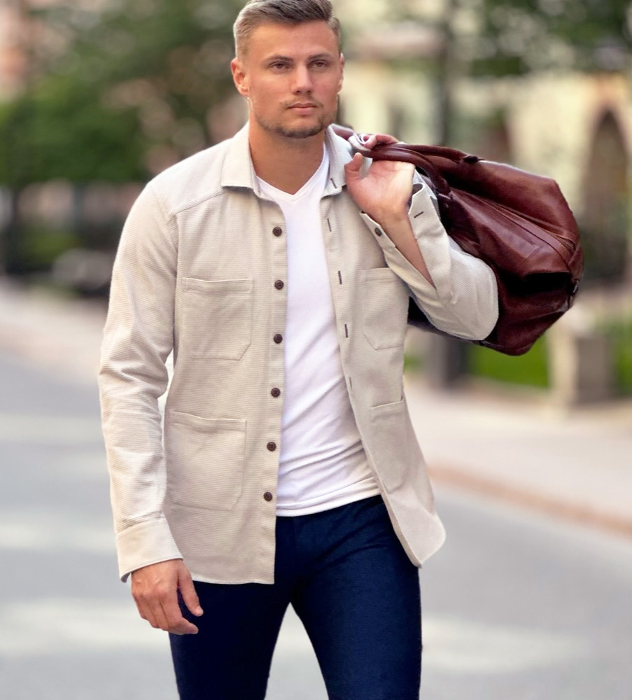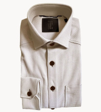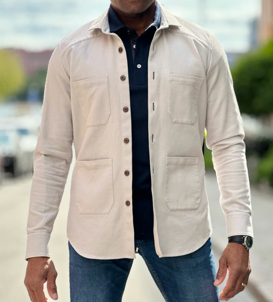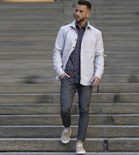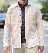 Vår mångsidiga överskjorta i en härligt grå-beige nyans med bruna knappar. Tyget är vävt med en kraftfull struktur där trådarna är sammanflätade på ett sätt som skapar en kantig textur som ger skjortan en tredimensionell effekt. Skjortan fungerar även som en lättare jacka och går att matcha över de flesta plagg. Med ett förskjutet ok får plagget en snygg linje över axlarna. Styla gärna overshirten med manschetterna öppna, som på bilden, för en skön look. Fyra rymliga fickor framtill, samt en metallkedja invid kragståndet för praktisk upphängning. På bilden: Lagos höga sneakers i mocka >> Kurbitz skjorta >> Faro höga sneakers i mocka >>
